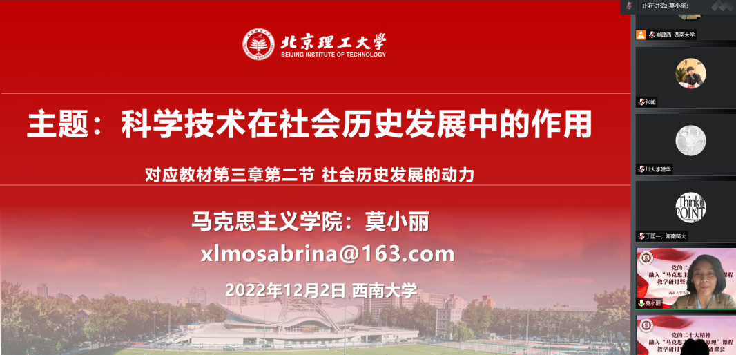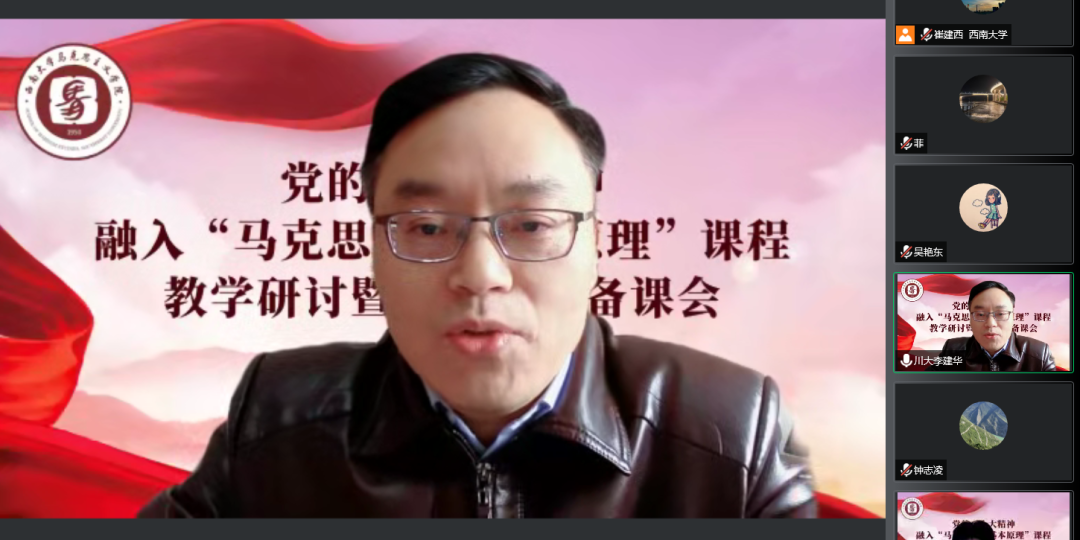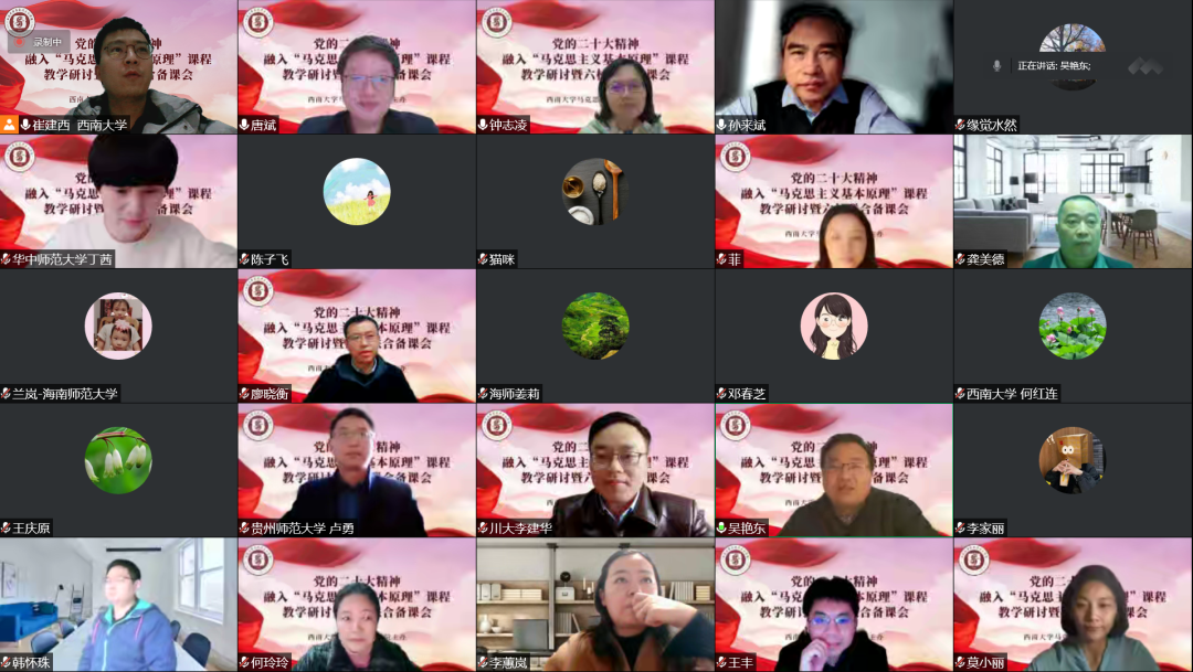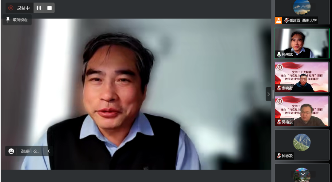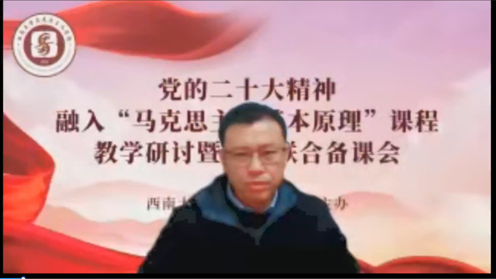 2022年12月2日上午,党的二十大精神融入“马克思主义基本原理”课程教学研讨暨六校联合备课会在云端顺利召开。本次活动由bv伟德国际1946主办,全国高校思想政治理论课“手拉手”集体备课中心(伟德victor1946-重庆市)、重庆市大中小学思政课一体化建设协同创新中心承办,四川大学bv伟德国际1946、北京理工大学bv伟德国际1946、华中师范大学bv伟德国际1946、贵州师范大学bv伟德国际1946、海南师范大学bv伟德国际1946五所高校联合协办。会议分为开幕式、专家导学、示范教学、研讨交流、集体备课五个阶段,由bv伟德国际1946副院长吴艳东教授、bv伟德国际1946副院长王丰教授主持。