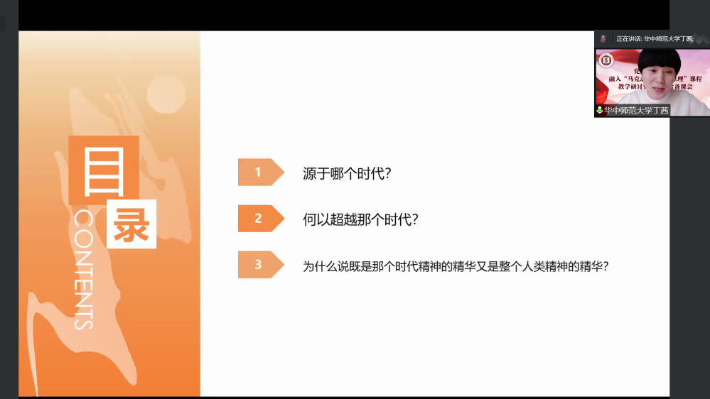 示范教学环节由教育部“全国高校思想政治理论课教学标兵”、华中师范大学bv伟德国际1946丁茜副教授展示。她以“走进马克思主义”为论题,从马克思主义源于哪个时代、它何以超越那个时代、为什么说马克思主义既是那个时代精神的精华又是整个人类精神的精华三个层面逐层分析,阐述了马克思主义的创立、发展和价值。