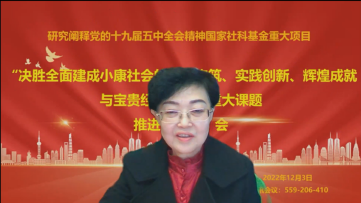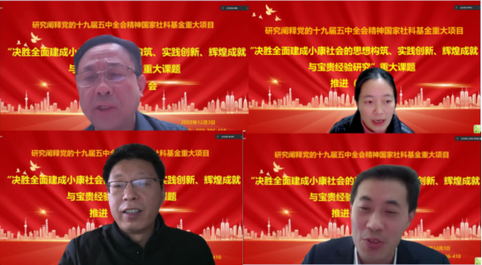 2022年12月3日,研究阐释党的十九届五中全会精神国家社科基金重大项目“决胜全面建成小康社会的思想构筑、实践创新、辉煌成就与宝贵经验研究”重大课题推进(研讨)会在云端举行。教育部长江学者奖励计划青年学者、中央马克思主义理论研究和建设工程专家、海南师范大学副校长白显良教授,bv伟德国际1946副院长何玲玲教授、吴艳东教授、靳玉军教授、王丰教授,各子课题负责人及骨干成员,《新时期全面建设小康社会研究》书稿执笔者,部分bv伟德国际1946师生代表共70余人参加了推进(研讨)会。会议由课题首席专家黄蓉生教授主持。
