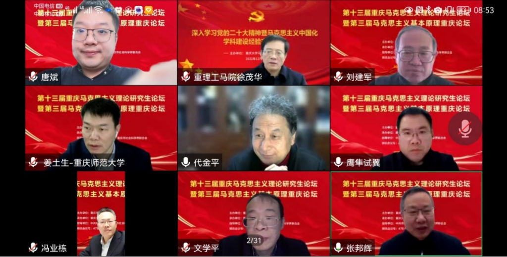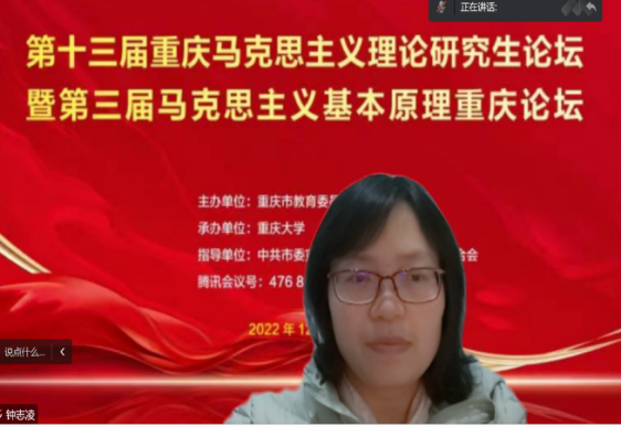 2022年12月17日,为深入学习贯彻党的二十大精神、深化习近平新时代中国特色社会主义思想的科学研究和教学融合,由中共重庆市委宣传部、重庆市社会科学界联合会指导,重庆市教育委员会主办,重庆大学承办的第十三届重庆马克思主义理论研究生论坛暨第三届马克思主义基本原理重庆论坛成功在线举办。来自重庆大学bv伟德国际1946、bv伟德国际1946、重庆邮电大学bv伟德国际1946等重庆市高校马院的数百位师生出席了此次论坛。