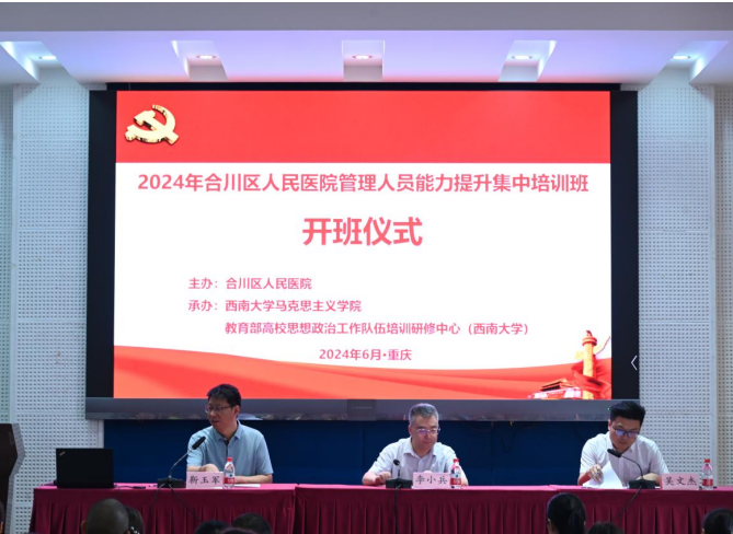 6月20日上午,重庆市合川区人民医院管理人员能力提升集中培训班在bv伟德国际1946501会议厅顺利开班。重庆市合川区人民医院党委书记李小兵,bv伟德国际1946党委书记吴文杰出席开班仪式,bv伟德国际1946副院长靳玉军主持开班仪式。