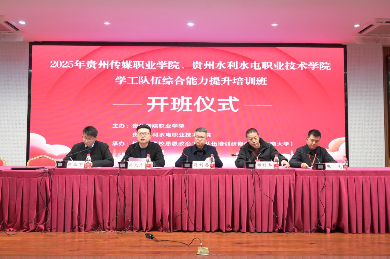 随后,贵州传媒职业学院党委书记蒋刘恩和贵州水利水电职业技术学院土木工程分院党总支书记邹利军作开班动员讲话。他们表示,此次培训班课程内容全面覆盖、重点突出,涵盖了思想意识的提升、辅导员专项技能、心理健康教育、学生事务管理等多个方面。希望通过此次培训,进一步加强学校学工队伍建设,推动学生工作再上新台阶,为两校高质量发展贡献更大的学工智慧和力量。