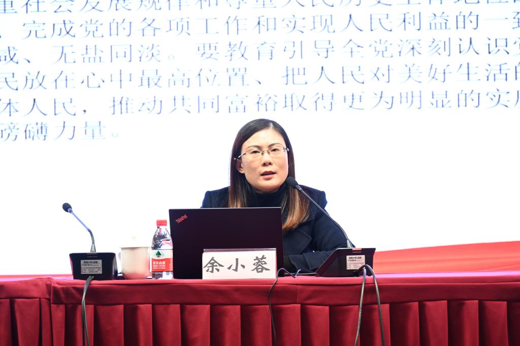 首先,余小蓉从党员的自身修养入手,为学员们讲述了一个合格党员的自我要求与规范。随后,简洁明了地讲解了中国共产党的性质,用“两个先锋队,一个核心,三个代表”简洁表述使学员们明确了我党的性质。其次,用“中国共产党为什么好,中国特色社会主义为什么好,归根结底是马克思主义行”引出对党的指导思想的讲解。根据中共十九届六中全会会议公报,分别从毛泽东思想、邓小平理论、“三个代表”重要思想、科学发展观和习近平新时代中国特色社会主义思想深刻地分析了马克思主义在中国扎根并中国化的进程。