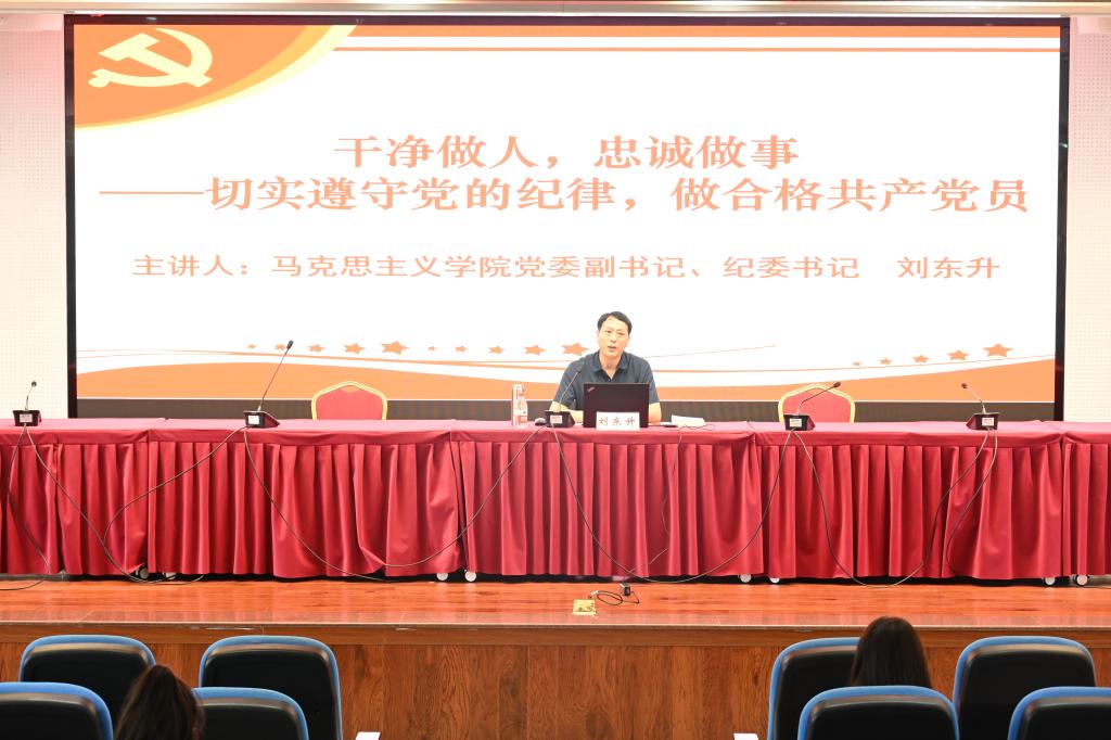 集中教育培训第三课,由学院党委副书记、纪委书记刘东升作《干净做人,忠诚做事,切实遵守党的纪律,做合格共产党员》主题党课。刘东升副书记指出,中国共产党之所以能够百年仍风华正茂,关键就在于中国共产党有严密的组织和严明的纪律。并结合大量现实案例对党的六大纪律进行了具体讲解。教育引导大家第一身份是党员,必须强化对党的性质、宗旨和纪律的认识,坚持挺纪在前,守住底线,保持对党纪国法的敬畏,做政治上的明白人,组织上的忠诚人,生活中的老实人。最后,刘东升副书记勉励大家在今后的学习和工作中要强化理论学习与武装,做讲政治、讲纪律、讲规矩的践行者和带头者。