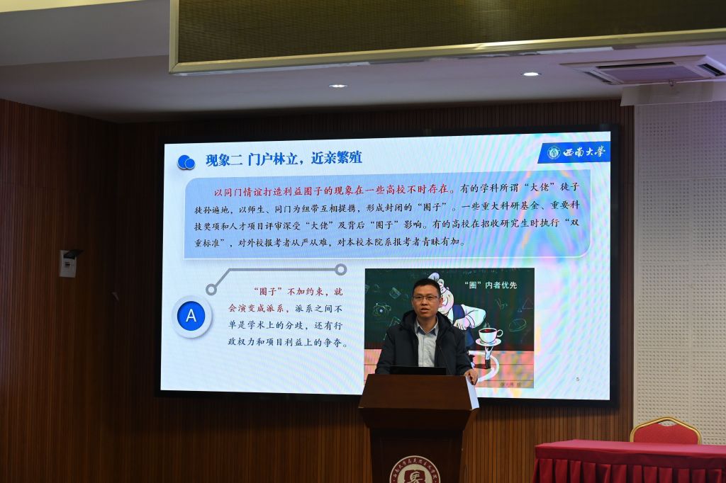 最后,学院将学习习近平关于力戒形式主义官僚主义重要论述及《晒一晒“象牙塔”里的那些官僚主义》作为学院廉洁专题教育进行了学习。廖书记带领大家对《习近平关于力戒形式主义官僚主义重要论述选编》进行了集中学习,深化了全体教职工对形式主义官僚主义的认识。同时针对高校中存在诸如“‘官气’十足,衙门做派”、“门户林立,近亲繁殖”、“不务正业,攀附结交”、“好高骛远,贪图虚名”四个方面的形式主义官僚主义现象,要求学院领导干部和全体教职工对照反省,自查自改,积极营造健康的育人环境。
