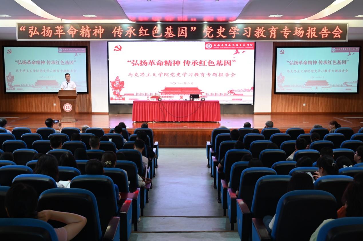 6月11日下午,bv伟德国际1946党委举行“弘扬革命精神,传承红色基因”党史学习教育专场报告会。bv伟德国际1946离休老同志、全体教职工和2020级全体本科生等老中青三代师生参加报告会,共同学习“红岩精神”。学院党委常务副书记廖晓衡主持报告会,重庆市党史学习教育宣讲团成员、学校党委副书记兼bv伟德国际1946学院党委书记潘洵同志作《与时俱进认识和弘扬红岩精神》专题报告。