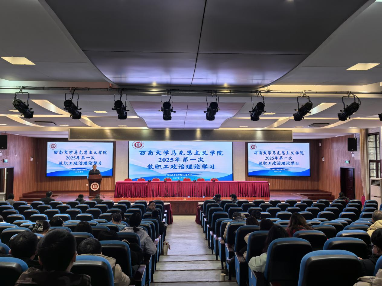 2025年1月7日下午,学院在505报告厅开展2025年第一次教职工政治理论学习,集中学习了国家主席习近平发表的二〇二五年新年贺词、习近平总书记在全国政协新年茶话会上的重要讲话精神、习近平总书记在庆祝澳门回归祖国25周年大会暨澳门特别行政区第六届政府就职典礼上的重要讲话精神和习近平总书记对做好“三农”工作作出的重要指示精神。学院全体教职工参加,会议由学院党委副书记、纪委书记曾艳主持,本次教职工政治理论学习由学院党委委员、副院长唐斌教授领学。