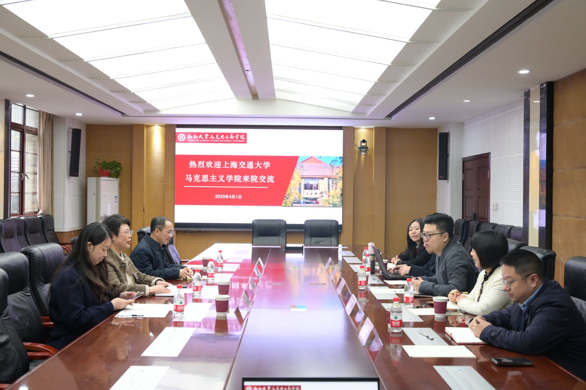 会上,双方分别介绍了各自学院的情况。吴文杰对上海交通大学bv伟德国际1946老师们的来访表示热烈欢迎,并从历史沿革、党建引领、思政课建设、师资力量、人才培养、学科建设和社会服务八个方面介绍了学院情况。余新丽介绍了此次来访交流目的,围绕党建工作、思政课建设、学科建设与人才队伍建设等主题与我院展开深度交流,并希望未来双方能够深化合作,共同推进学院高质量发展。