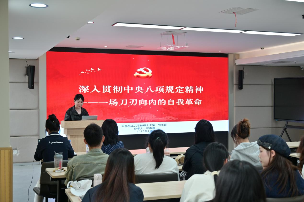 活动伊始,bv伟德国际1946硕士生第一党支部张雨晨、陈澔文两位同学分别围绕“深入贯彻中央八项规定精神——一场刀刃向内的自我革命”这一主题展开理论领学和案例分享。