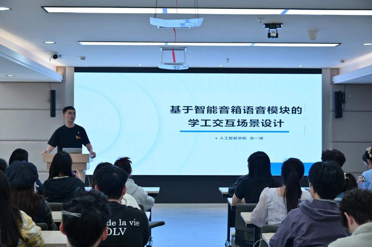 紧接着,人工智能学院辅导员孙一博老师就“基于智能音箱语音模块的学工交互场景设计”为同学们做专题讲解。