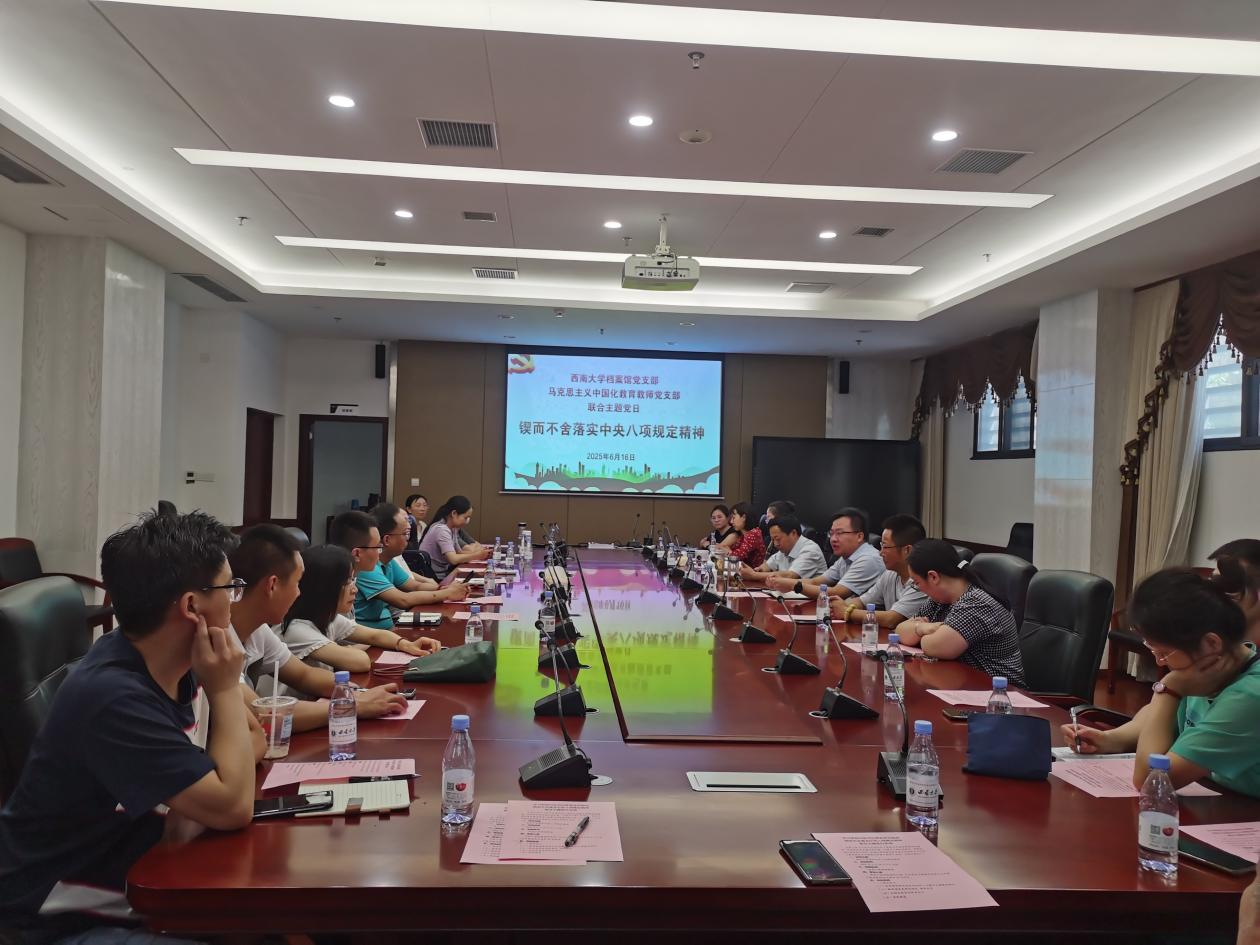 理论学习环节,马克思主义中国化教育教师支部书记易艳华领学了《党的十八大以来深入贯彻中央八项规定精神的成效和经验》,强调党员同志要认真学习习近平总书记关于加强党的作风建设的重要论述和中央八项规定及其实施细则精神,学习好运用好深入贯彻中央八项规定精神的成效和经验。伟德victor1946档案馆副馆长郑劲松以“血色青春 信仰力量——伟德victor1946校史上的红岩英烈”讲述微党课,从红岩英烈的坚定党性和优良作风的角度,讲述了他们为信仰而斗争的故事,号召党员同志们矢志不移坚定理想信念,发扬优良作风。