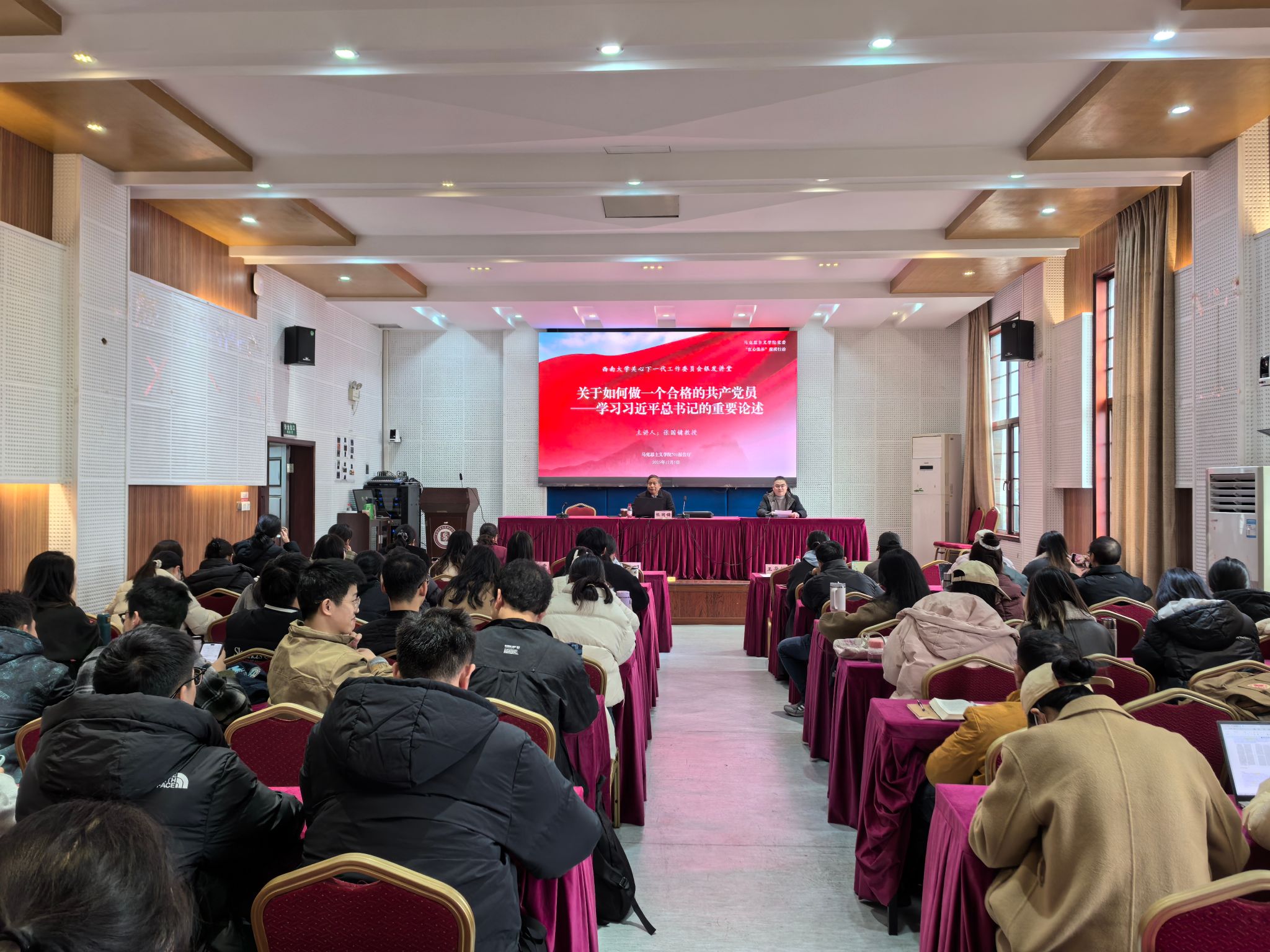 2025年12月5日14:30于学院501报告厅开展“西大红”五老服务团银发讲堂,我院退休教师张国镛教授就“如何做一名合格的共产党员——学习习近平总书记的相关重要论述”进行讲授。伟德victor1946关工委副秘书长、“西大红”引航服务部部长周大明、“西大红”五老服务团成员、bv伟德国际1946关工委副主任曾光霞副教授,学院各党支部书记和部分学生党员代表参加讲座,讲座由学院纪委书记、副处级组织员王华敏主持。