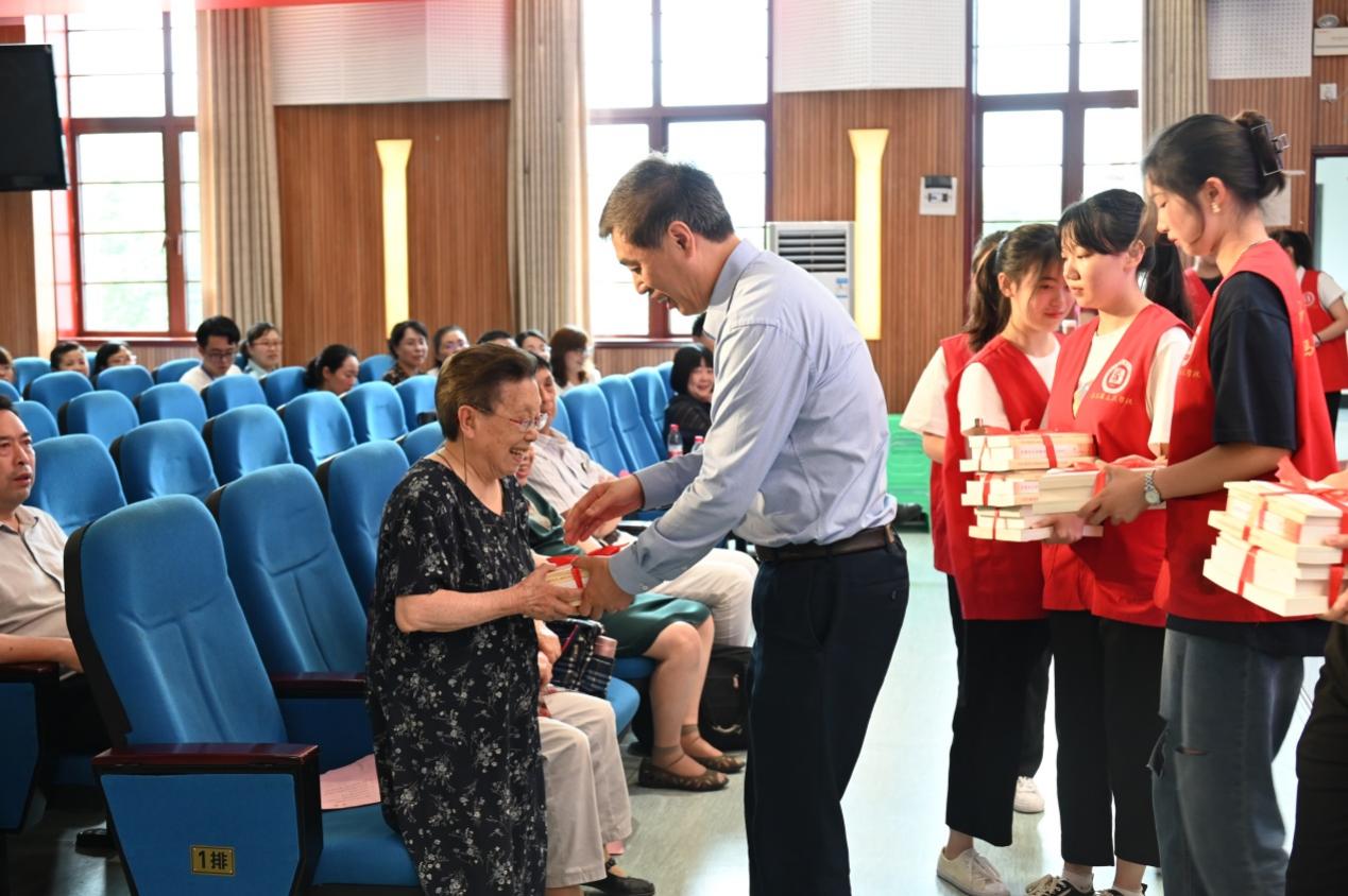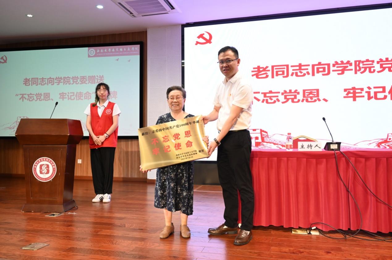 专题报告会之前,学院离退休老同志向学院赠送“不忘党恩,牢记使命”匾牌,学院向老同志赠送党史学习教育有关书籍。离退休老同志代表、93岁高龄的陶燕云老师讲话,深情回忆了学院的发展历史,希望马克思主义在学院发扬光大。廖晓衡在主持报告会时强调,学院改革发展成绩的取得,是全院师生员工奋力拼搏的结果,也是离退休老同志关心支持的结果。没有老同志辛勤努力打下的江山,就没有马院改革发展的今天。我们要永远牢记老同志的历史功绩、永远牢记老同志的优良传统、永远牢记老同志的敦敦教诲。