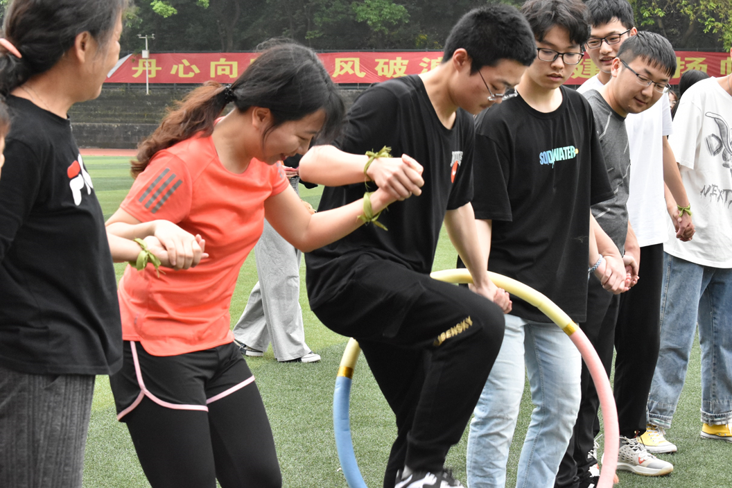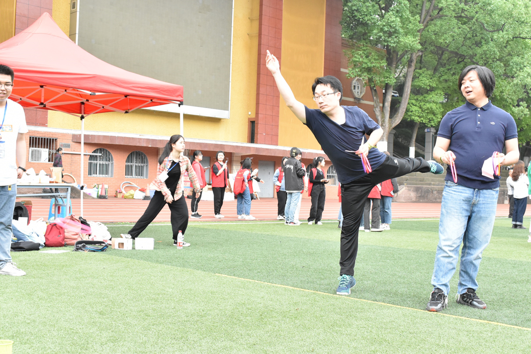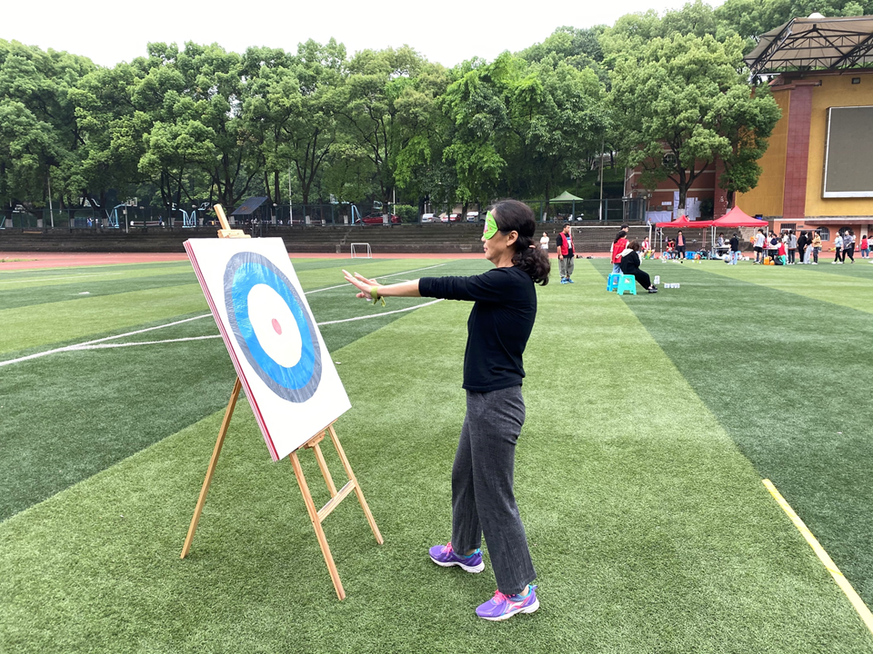 在集体游戏进行过程中,个人游戏项目环节也如火如荼地进行着。在“挥斥方遒”游戏中,不时能听到老师和同学们幸运地套中奖品后爆发的欢呼声;而在一旁最受欢迎的“掷地有声”游戏中,也总会出现以新奇的方式用球击倒垒成塔型的易拉罐,博得大家的称赞。最热闹的游戏当属“上下求索”,参赛者们转完圈后憨态可掬的模样俨然收获了全场的欢声笑语。