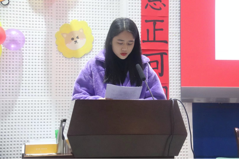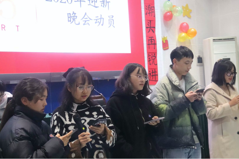 最后,由文体部主持2022年迎新晚会动员大会。文体部全体工作人员上台献唱一首《告白气球》点燃全场热情。一首曲毕,文体部负责人代表傅雅上台发言,宣读 2022年迎新晚会前期注意事项,提出了迎新晚会工作任务的困难性,鼓舞全体工作人员提高工作积极性,并对迎新晚会具体人员分工名单进行了宣读。之后,文体部工作人员依次上台宣读bv伟德国际19462022年迎新晚会话筒组、催台组、道具组、音乐组注意事项。