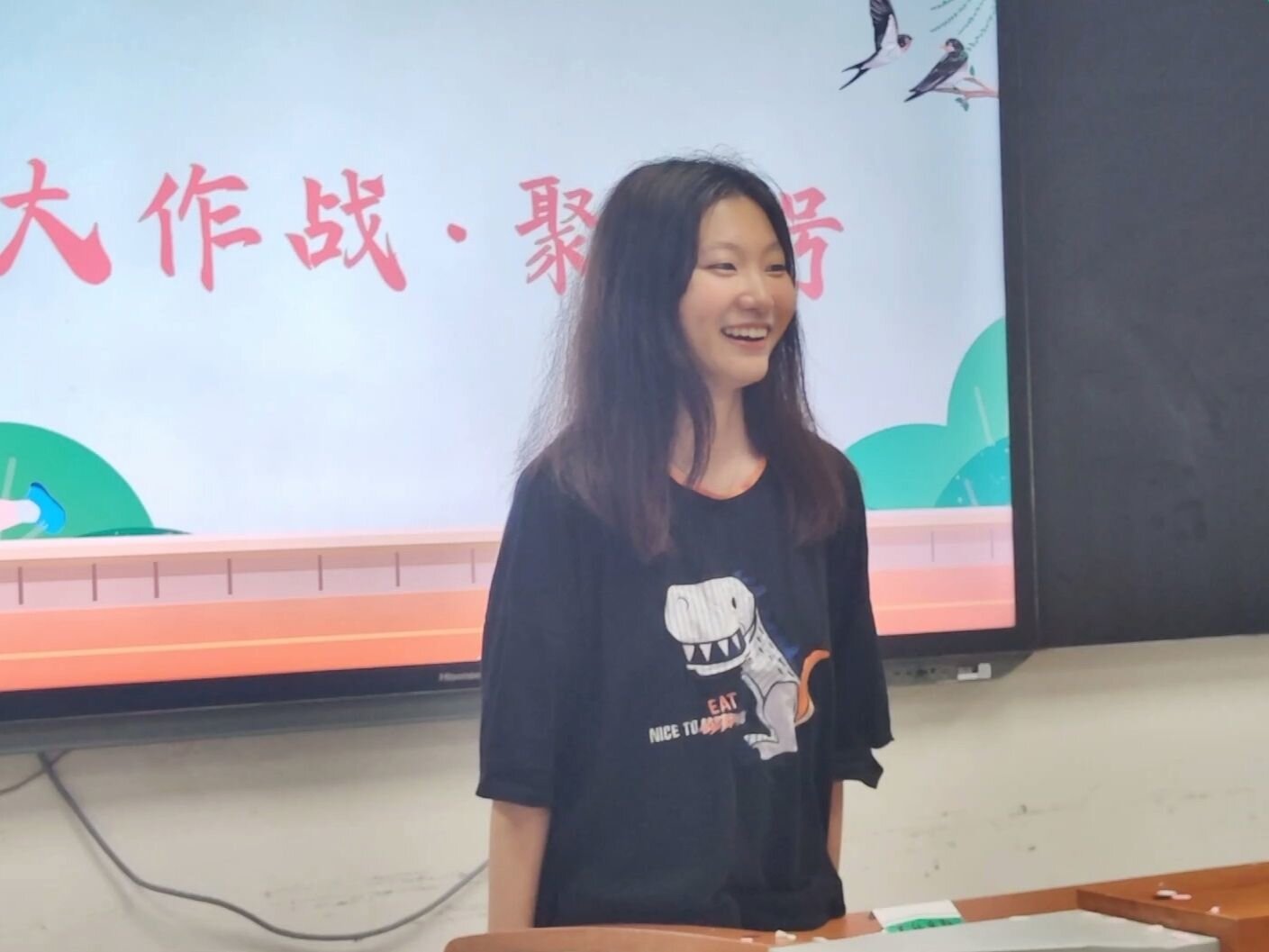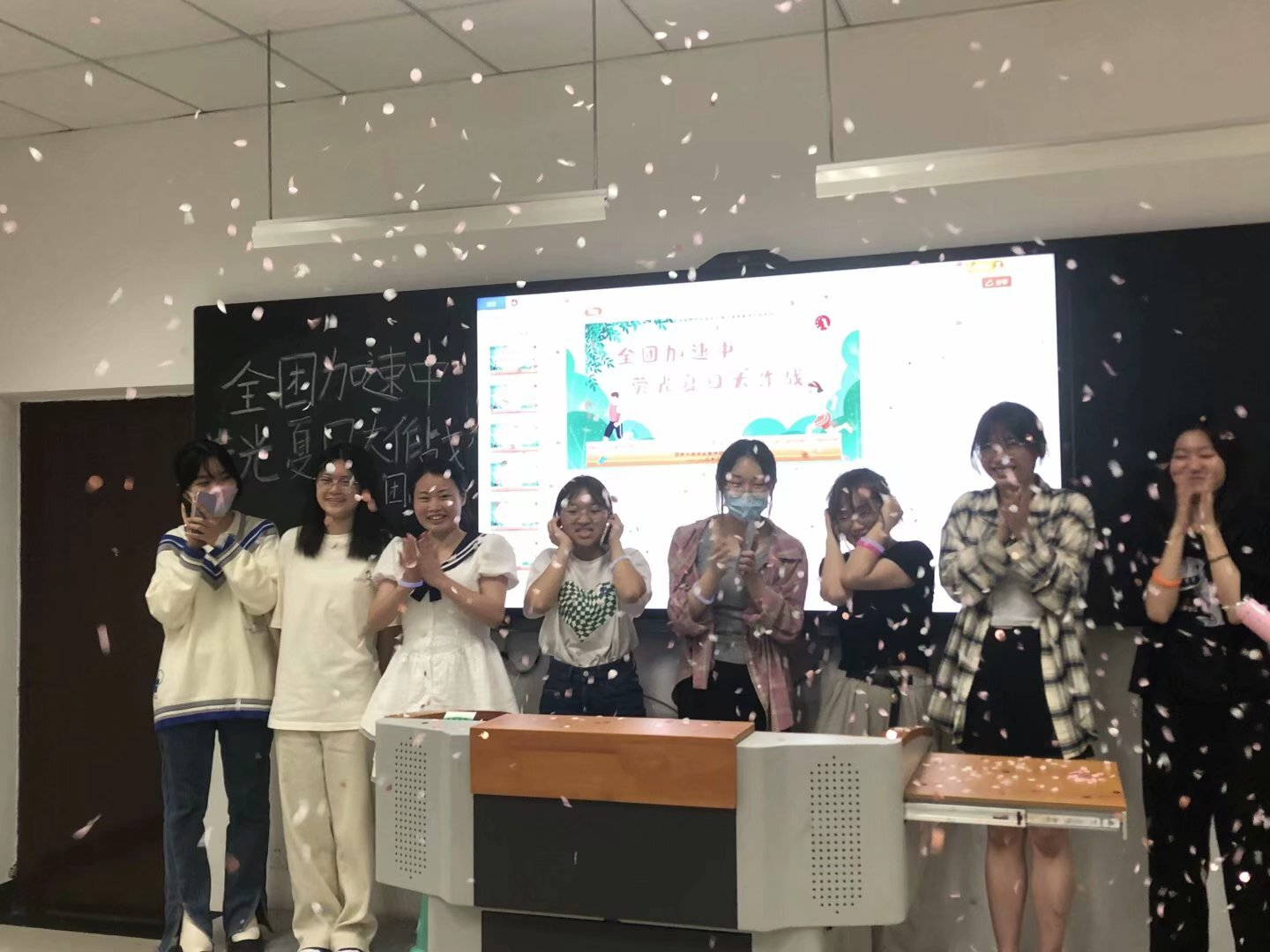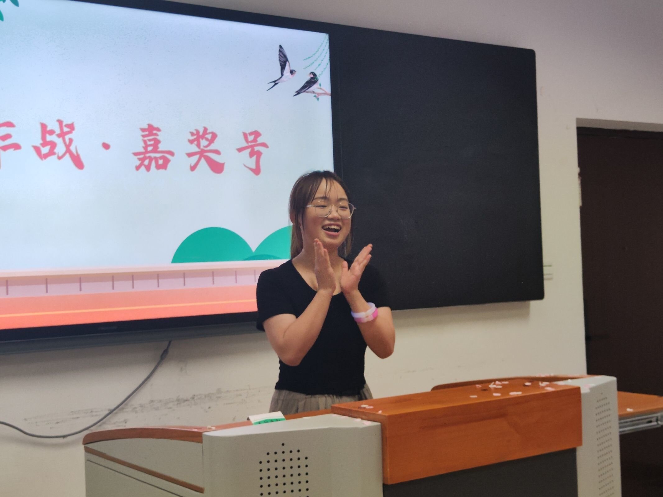 快乐的时光总是短暂的,40分钟的游戏在欢乐与刺激的氛围中很快接近了尾声,团员们在各队负责人的组织下有序地回到了bv伟德国际1946研究生教室三进行短暂休息。等待游戏结果公布的间隙,工作人员杨琪和程诗雅采用现场录制VCR的形式采访了团员们对团日活动的感受以及对宣讲团的美好祝愿。镜头前,团员们恣意欢笑,畅所欲言,眉眼之间满是喜乐与温情。随着现场采访拍摄的结束,最终的积分统计结果出炉,蓝队以51分位列第一,最终获得了胜利!在热烈的掌声与欢呼声中,蓝队全体队员上台领奖。伴随着礼炮声响起,现场的氛围达到了高潮,全体团员纷纷为自己在游戏中的表现以及宣讲团浓厚的家文化而鼓掌。