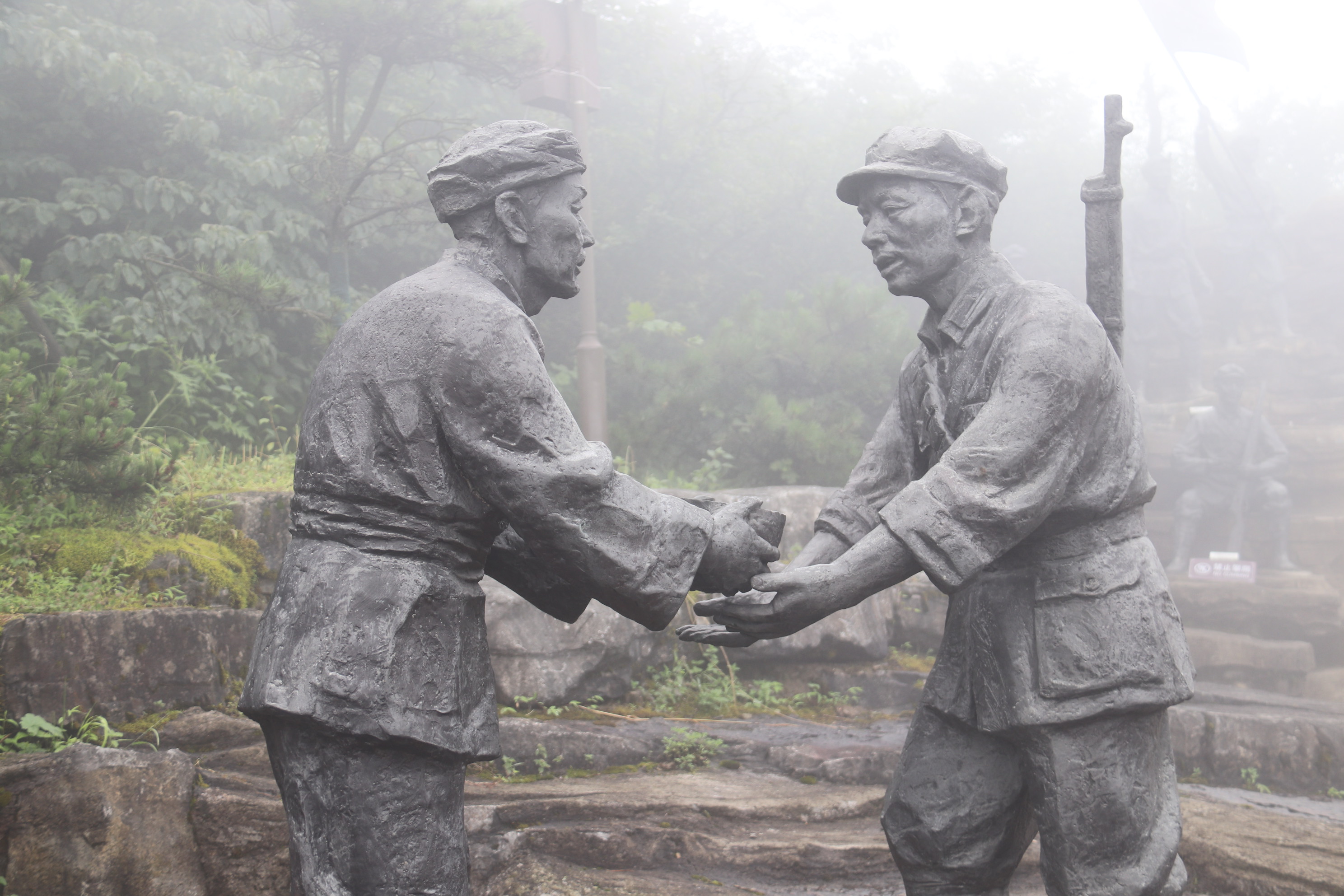 实践团娄山关的第一程来到了西风台。经过一段蜿蜒曲折的山路后,“茫茫大娄山、一关连一关”的场景生动地展现在成员眼前。接着映入眼帘的是一组描述战争胜利后战士们欢呼雀跃、军民和谐相处情景的铜像。在红色文化与自然风光的交相辉映中,实践团成员感悟到了先烈们伟大的革命精神与自身所肩负的光荣使命。