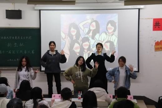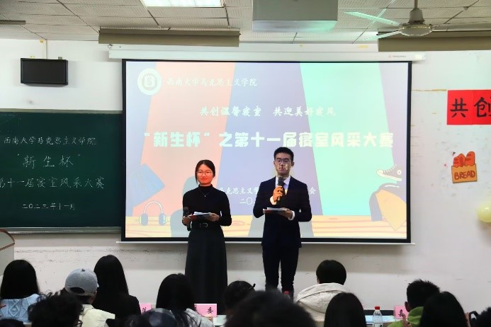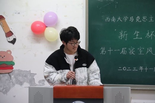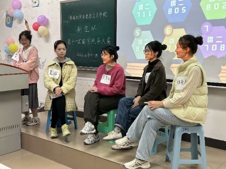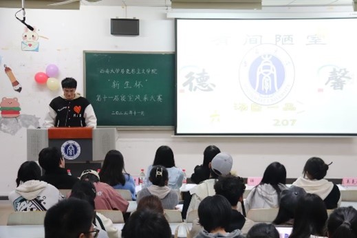 在PPT展示环节,各寝室派出代表对本寝室的寝室名称、成员组成、专属 logo等进行解读,展示了各具特色的寝室文化和温馨和谐的寝室氛围,并在PPT结尾播放寝室创意视频,内容积极向上,体现了当代大学生的精神风貌。