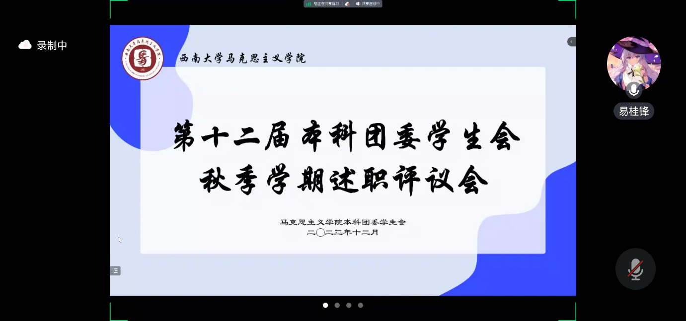 为进一步规范团委学生会述职评议工作,bv伟德国际1946团委学生会特于2023年12月23日19时在腾讯会议线上举办bv伟德国际1946第十二届本科团委学生会秋季学期述职评议会。bv伟德国际1946第十二届本科团委学生会成员出席大会。