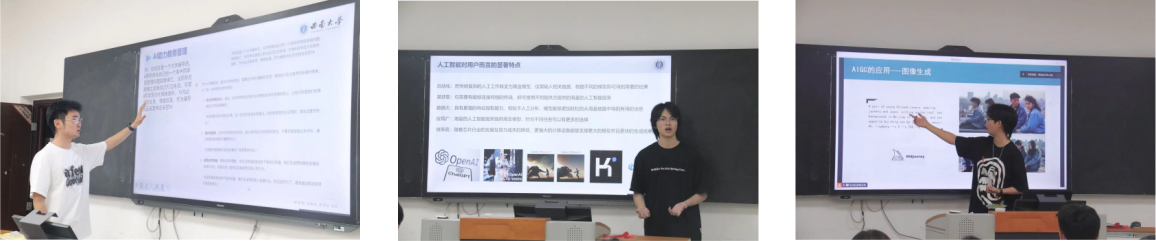 在分享环节,孙宇龙介绍了人工智能的生成史与其在教育领域的应用,着重分析了OpenAI最新大模型Sora作为生成式人工智能在教务管理、课程安排、课件制作等方面的作用。方承煜则侧重于教师合理利用数字化工具提升教学效率和质量的方法,讲述了人工智能在教学领域已经实现应用的场景描述。张玥通过实操演示,为同学们讲解文心一言的文案撰写、AIGC的图片视频资料的修复和生成功能等多种人工智能软件的具体应用方法。