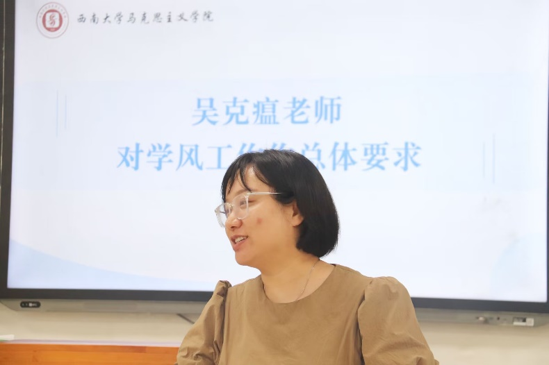 吴克瘟老师对本科生学风建设工作提出三点建议。一是以学生需求为牵引,将学风建设措施落到实处。二是以学生发展为目标,促进学风建设内容融入学生日常学习中。三是坚持问题意识,敢于发现问题、善于解决问题,树立良好的院风、学风、班风、寝风。