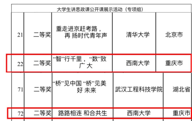 近日,“七十五载薪火传承,千秋伟业奋斗有我”——第八届全国高校大学生讲思政课公开课展示活动获奖名单公布。学院报送作品《“智”行千里,“数”致广大》、《路路相连 和合共生》在1339所高校提交的5007部大学生讲思政课公开课作品中脱颖而出荣获二等奖。