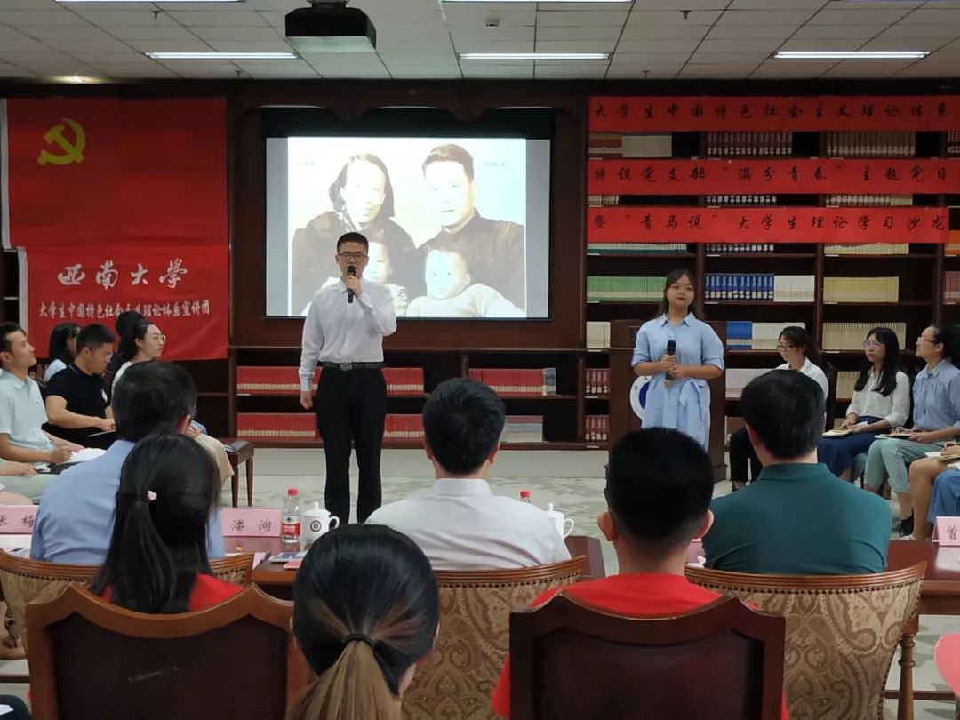 紧接着,特设党支部的研究生孙瑞杰师兄用自己丰富的人生履历,让我们了解到以为服务奉献为底色的青春是多么的有意义,有价值。他用毛泽东,习近平等伟人的奋斗青春来激励自己,同时也激励着我们,不断向前。