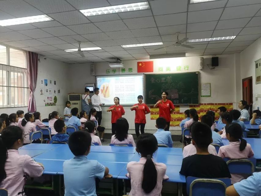 伴随着清脆的快板声,陈禹星、文春翁、邓睿三位团员为大家带来快板舞;快板声里话中国,快板声伴着朗朗上口的快板词,顿时提起小朋友们的兴致,小朋友们用热烈的掌声表达对于快板舞的喜爱。之后,陈喜、杨惠婷两位团员化身为“爱国号”列车员,一边播放爱国少年——小萝卜头的爱国视频,一边讲解小萝卜头震撼人心的童年经历,小朋友们无不为小萝卜头的爱国精神所感动。随后,团员杨惠婷通过对当今幸福感的讲解,阐明了“国家是幸福的保障,同时祖国更需要每个人的用心呵护”的道理。团员陈喜则从生活入手,讲述了生活中的爱国孩童,看似平淡无奇,细细想来都是稚嫩童心追求爱国情怀与真善美的体现。