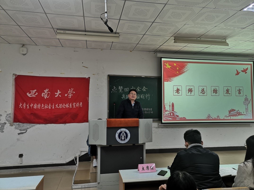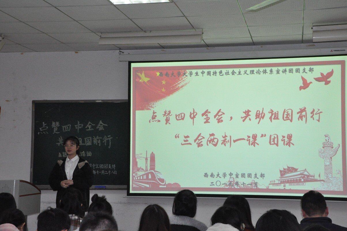 为深入学习贯彻十九届四中全会知识,增强团员们的家国情怀与责任意识,伟德victor1946大学生中国特色社会主义理论体系宣讲团团支部(以下简称“中宣团团支部”)于11月28日晚上七点在十教502举办“点赞四中全会,共助祖国前行”“三会两制一课”团课活动。