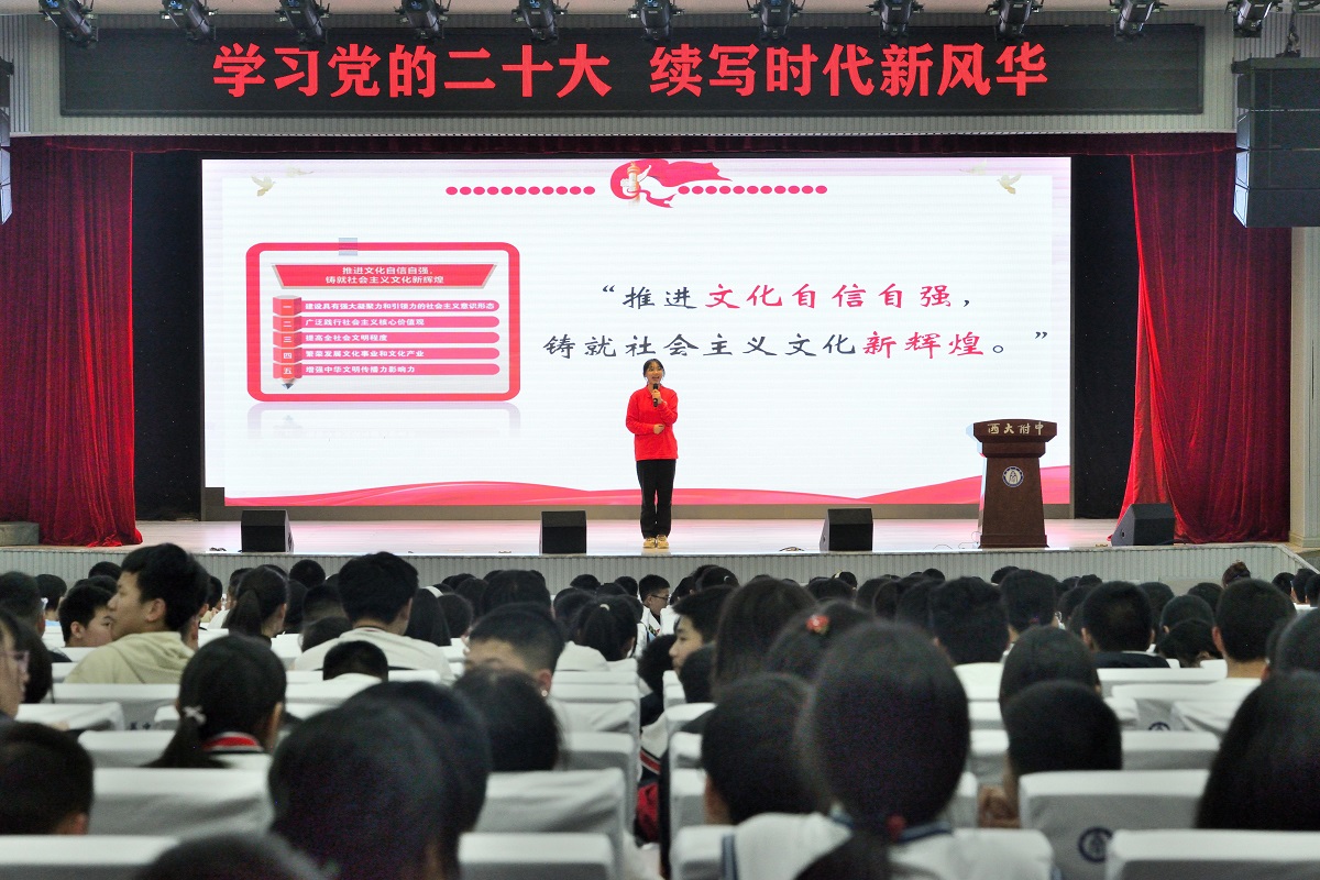 时代新声振强音,丰盈理论润人心。在向第二个百年奋斗目标全面进军的历史节点,为全面弘扬党的二十大精神,推动大中小学思政课一体化共同体建设,伟德victor1946大学生中国特色社会主义理论体系宣讲团(以下简称“学生宣讲团”)于2023年4月2日(星期日)19:00,在伟德victor1946附属中学(以下简称“附中”)开展“学习党的二十大,续写时代新风华”系列宣讲活动。本次活动针对中学生群体的认知能力与实践水平进行了精心设计,共有千余名师生参与,在听众中引发了热烈反响。