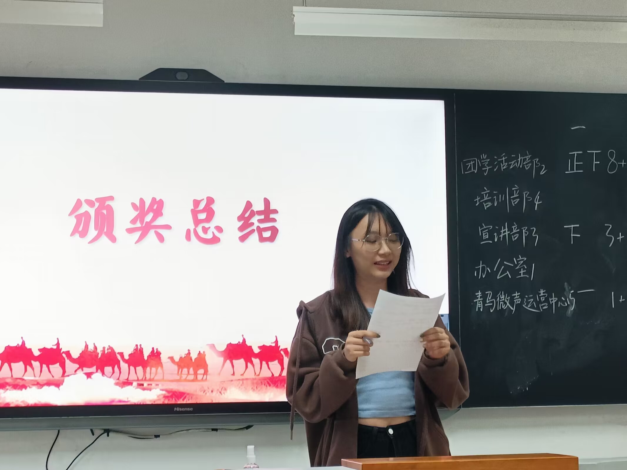 初步考核,锚点定位。在所有团员完成入营培训后,本环节采用积分制淘汰赛对前一环节的外交学习进行考核。考核官高菲设置形式多样的考题。团员们积极抢答,充分输出所学的外交知识。本环节的考核方式除了知识竞答,还有模仿秀。各部门按照PPT的抽签顺序派出代表对我国外交官的精彩发言片段进行模仿,让团员们在铿锵有力的“金句”中充分体会中国外交不卑不亢又泰然自若的风采,现场氛围其乐融融,“未来外交官”们已初露头角。在两轮模仿秀结束后,负责人在黑板上对各部门得分进行公示,团学活动部、宣讲部、青马微声运营中心积分前三,顺利成为实习外交官,办公室、培训部转型成为实习记者。