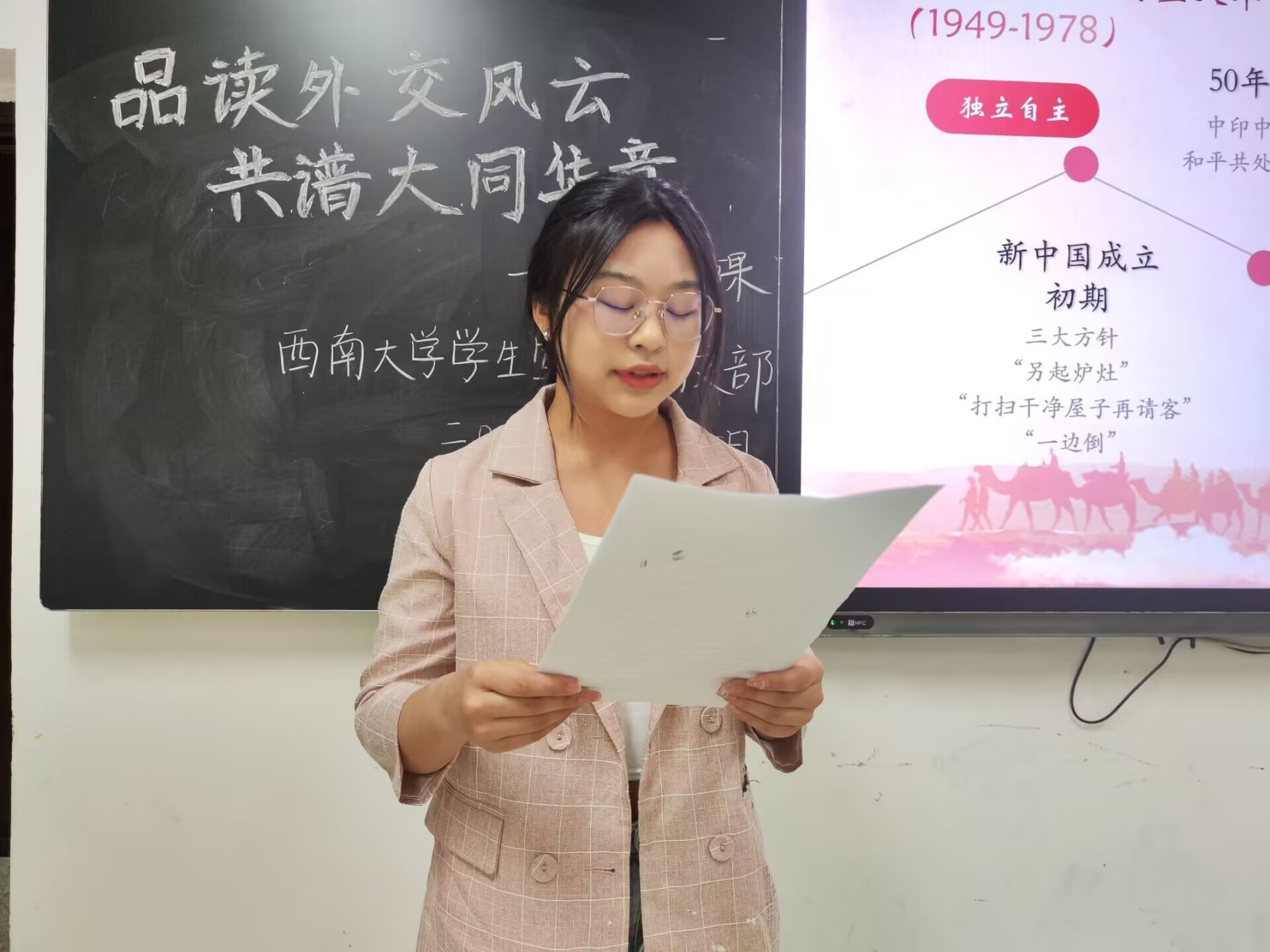 以史明理,慧识夯基。在外交101的考核角逐开始前,“文化导师”陶茜通过详略得当、重点突出的讲解带领团员们回顾了新中国成立以来的外交历史,让大家清晰地了解中国外交在国际形势风云变幻背景下的纵深发展。