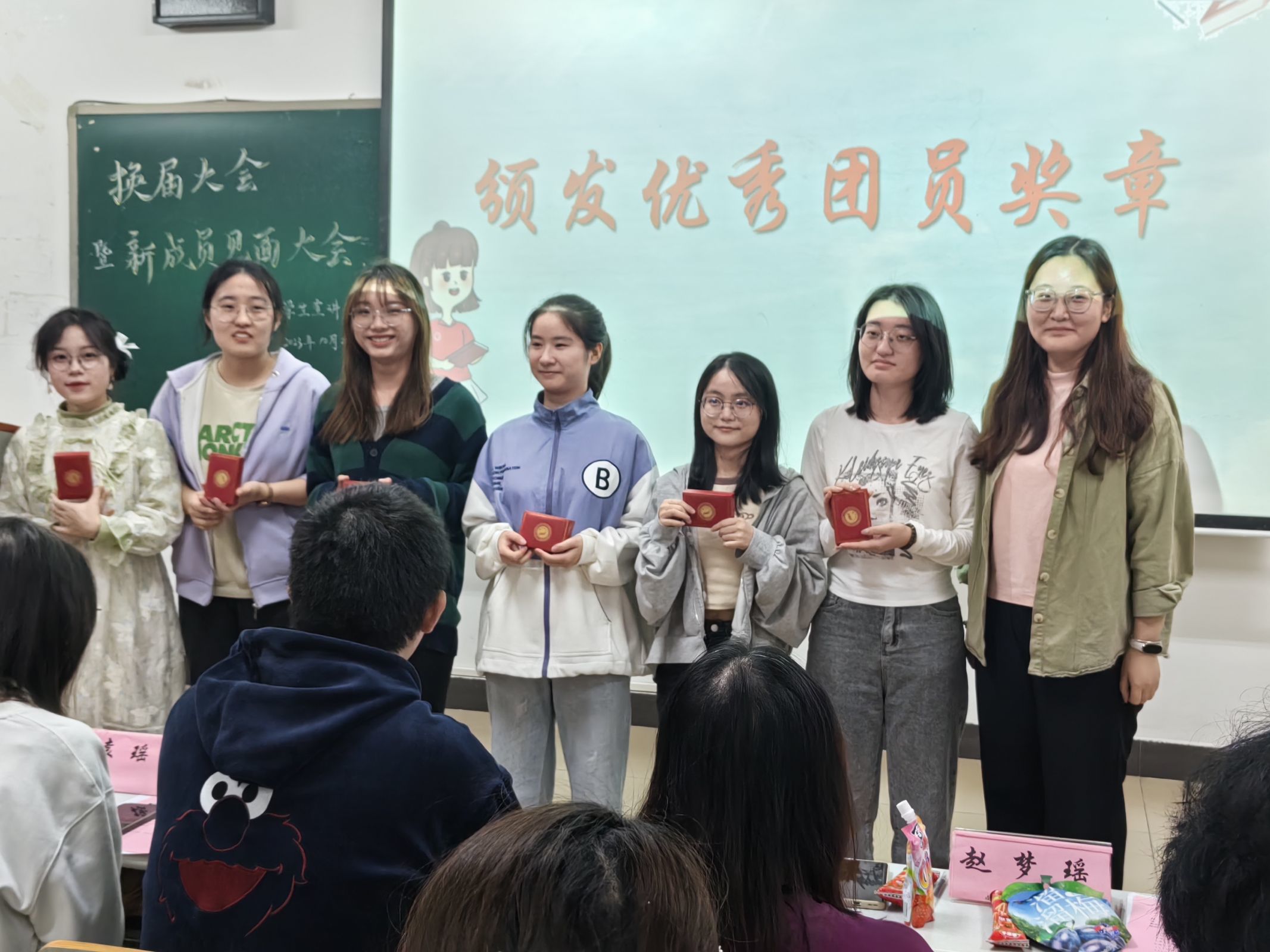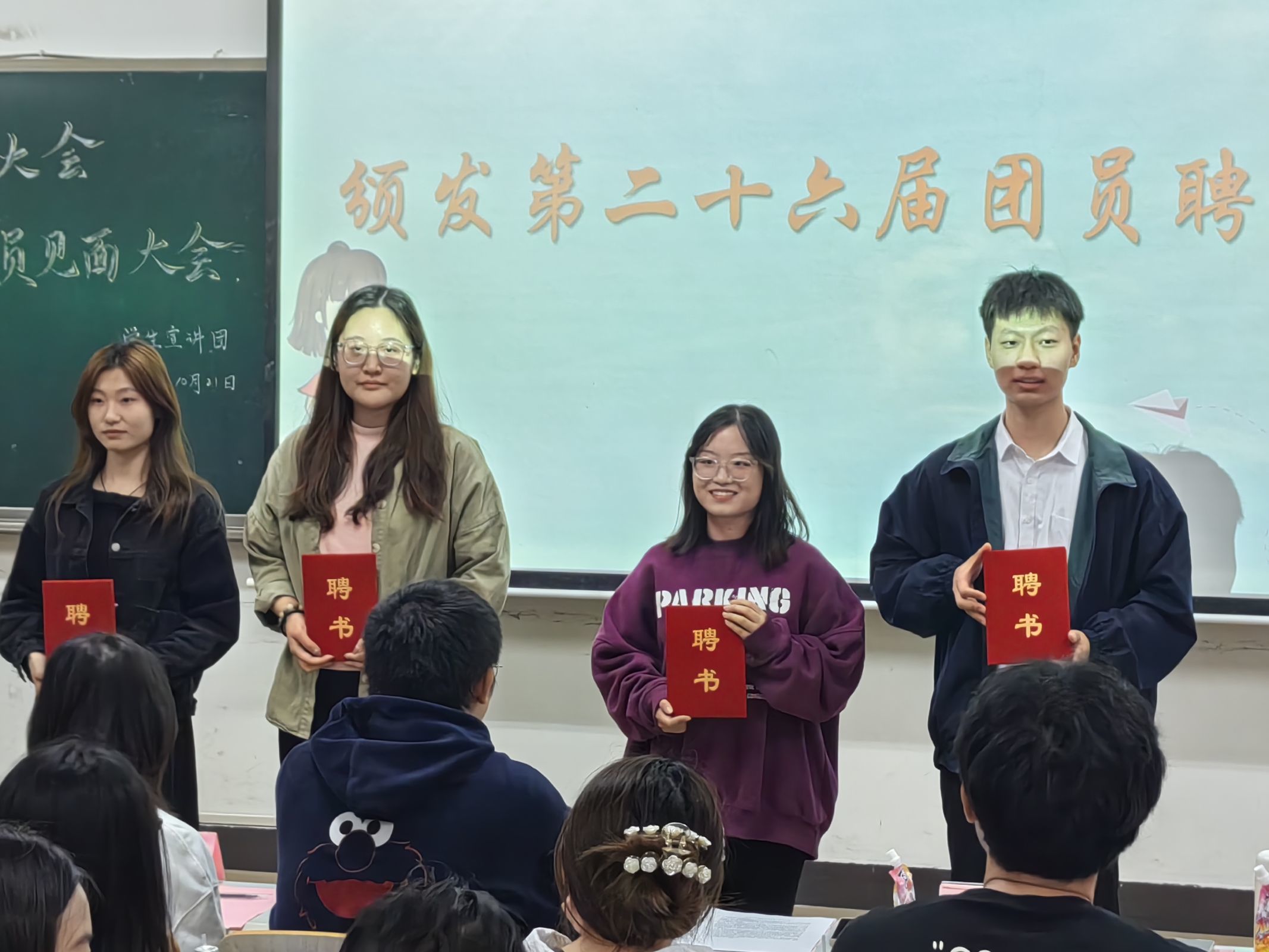 接下来,第二十七届学生宣讲团主席团代表杨雨鑫为第二十六届主席团及干部代表颁发聘书,第二十六届学生宣讲团主席团代表赵梦瑶为第二十六届干部颁发奖章。这是一个充满荣耀和激动的时刻,所有人都在为获得奖章的团员们庆祝。