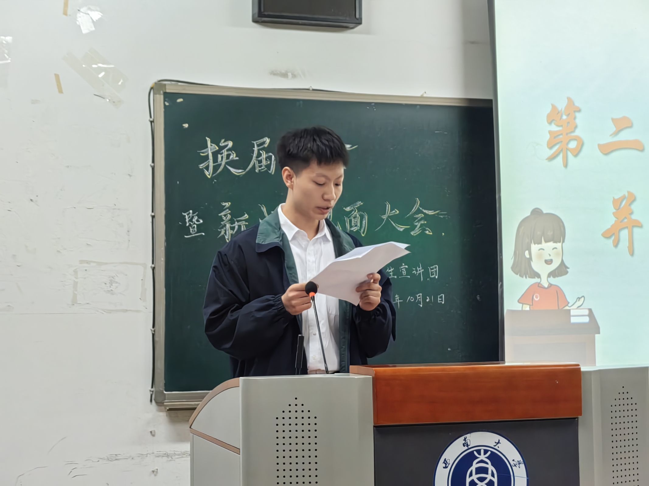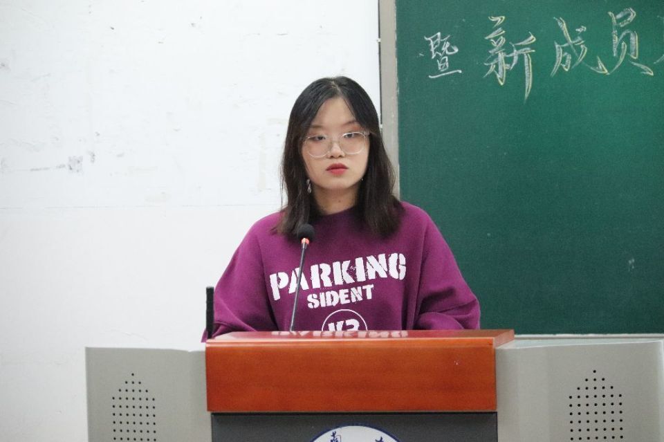 随后,学生宣讲团第二十六届团长郭嘉仪上台发表感言,第二十七届团长杨雨鑫发言并宣布任职任命,为新团员指明学生宣讲团的意义和使命,鼓励新一届小宣人们齐心协力、砥砺奋斗,共同谱写新的壮丽篇章。