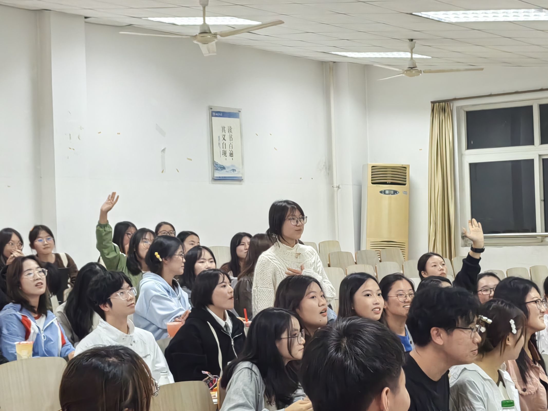 最后是娱乐环节,各部门的才艺节目与游戏活动穿插呈现,小宣人们在舞台上尽情展现自我,带来一首首或热情似火或柔情似水的歌曲,现场欢笑不断、掌声不止。穿插其中的三个游戏都充分考验参与者反应能力,锻炼思维灵活性。团员们热火朝天地讨论,积极地抢答,欢声雷动。各组默契十足,一张张开心的笑脸,一串串银铃般的笑声充盈着整个会场。这不仅是学生宣讲团家文化建设的生动体现,更增进了小宣人们的凝聚力和团队协作能力。
