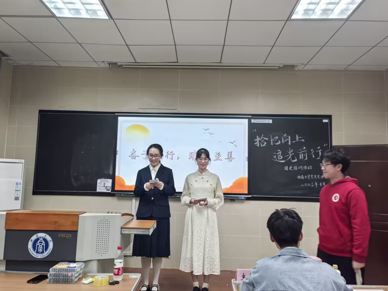 1027日晚,在国家治理学院3110拾忆向上,追光前行团史培训活动顺利开展。小宣人们在小团子及其朋友的带领下,通过团史知识竞答的方式,帮助失忆的思铭寻找承载学生宣讲团过往点滴的记忆碎片。同时,新团员们也在演绎一个个记忆碎片里感悟学生宣讲团的光辉历史,在聆听师兄师姐们的暖心寄语中明确身份担当,在以笔传情部门形象绘制环节中了解各部门职能特色。岁月如歌,往事成碑,前路漫漫,齐心向前。相信新一届小宣人必将以青春为帆、以理论为桨,在学生宣讲团的新征程上乘风破浪砥砺前行