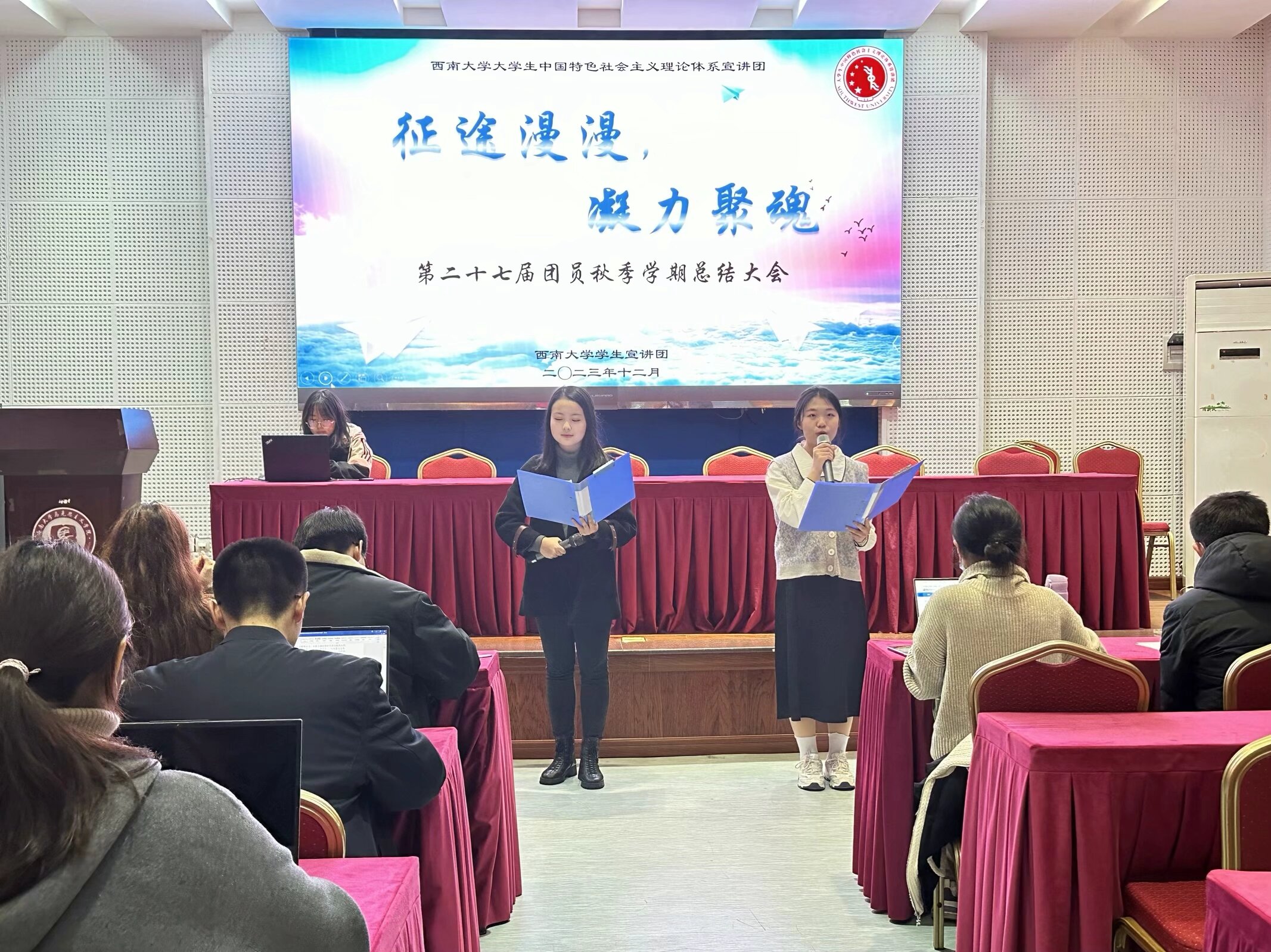 2023年12月9日晚,伟德victor1946大学生中国特色社会主义理论体系宣讲团(以下简称“学生宣讲团”)在bv伟德国际1946501报告厅举行了“征途漫漫·凝力聚魂”第二十七届团员秋季学期工作总结大会。本次活动总结了学生宣讲团过去一学期的工作成果,并对下一阶段的工作进行了总体规划,同时也加强了各部门间的交流与合作,促进了学生宣讲团的“家文化”建设。
