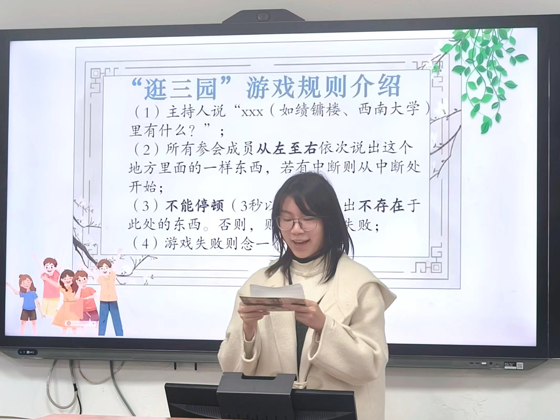 寓学于乐,妙趣横生。在“兰叶且葳蕤,少年正春风”环节中,团员们在主持人的带领下参与“逛三园”小游戏。现场的团员们可谓是各显神通,不仅活跃了思维,提高了临场反应能力,更是锻炼了语言表达能力。
