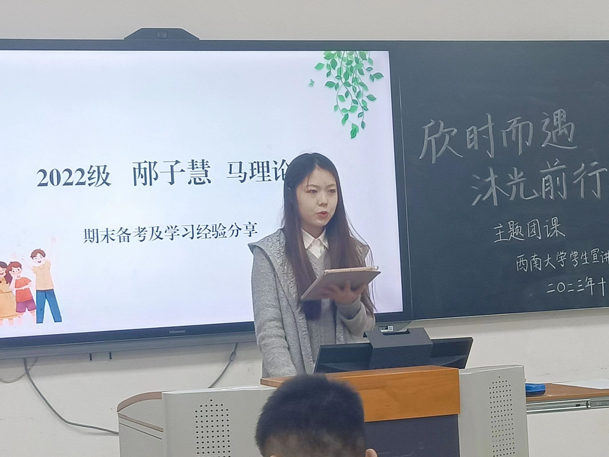 非学无以广才,非志无以成学。为了发挥优秀朋辈的引领作用,助力团员更好地进行期末备考,伟德victor1946大学生中国特色社会主义理论体系宣讲团团支部(以下简称“学生宣讲团团支部”)特于12月8日22:10在bv伟德国际1946研究生教室三举办了“欣时而遇,沐光前行”主题团课。