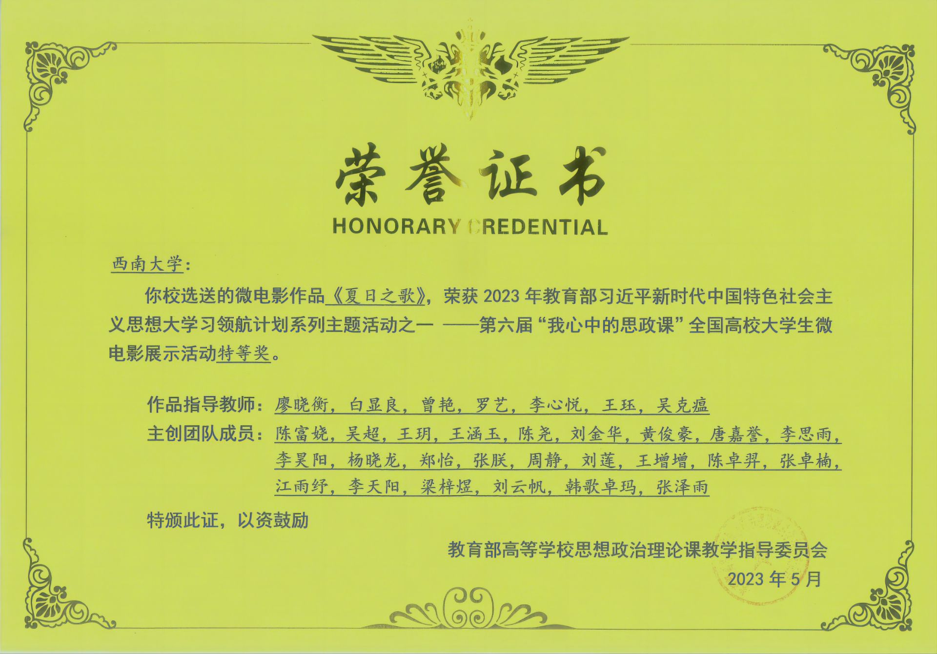 2023年,荣获第六届“我心中的思政课”全国高校大学生微电影展示活动特等奖