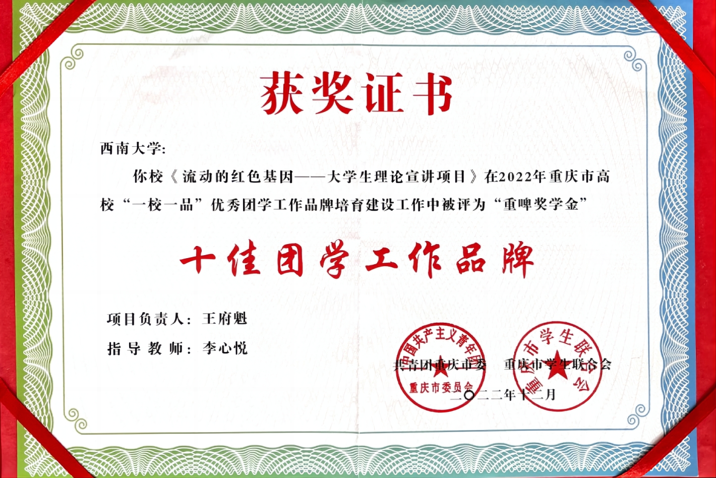 2022年,荣获2022年重庆市高校“一校一品”十佳团学工作品牌
