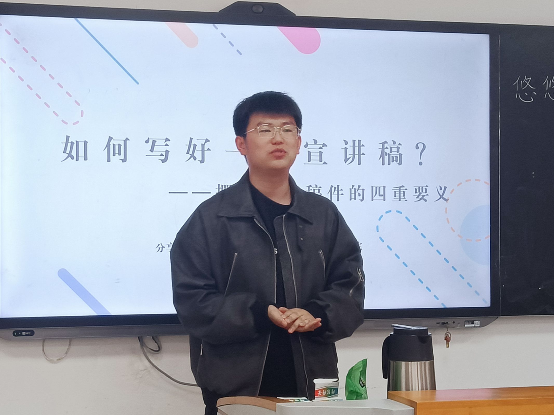 2024年5月10日,“悠悠文墨贯古今,文化时代共一色”主题宣讲比赛赛前培训在bv伟德国际1946研究生教室二成功举行。杨志远和吴珂仪两位特邀嘉宾对撰稿技能与宣讲仪态进行了讲解和示范,为接下来的宣讲比赛助力。