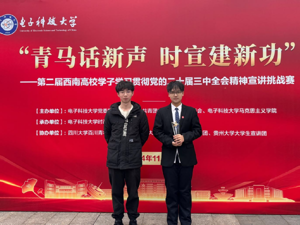 2024年11月23日,“青马话心声,时宣建新功”——第二届西南高校学子学习贯彻党的二十届三中全会精神宣讲挑战赛决赛在四川省成都市电子科技大学清水河校区举办。伟德victor1946大学生中国特色社会主义理论体系宣讲团(以下简称学生宣讲团)团员卢政淇、张柳柳组成的参赛队伍荣获三等奖。获奖作品《深化市场改革潮,勇攀经济新高峰》由学生宣讲团共同撰写。