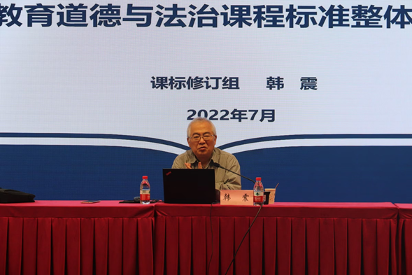 本次讲学主题为“道德与法治课程标准(2022年版)整体解读”,韩震教授从课程标准的时代背景、课程的理念和追求、课程标准修订的主要变化以及突破和道德与法治课程实施中的重点与难点四个方面进行深度解读。