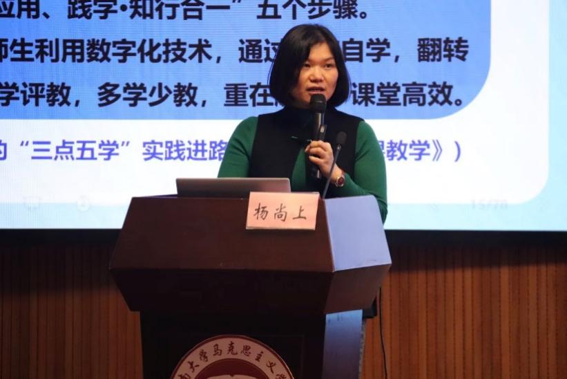 讲座现场,杨尚上老师从一线教学实践出发,探讨提升教师专业素养的方法。她表示“课堂教学是教师专业成长的主阵地,教育科研是教师专业成长的助推器”,教师需将信息技术与教育教学融合,实现课堂效率的提高。随后,杨尚上通过课例分享引导同学们思考“三点五学”教学模式的丰富内涵、理论依据以及数字化融合等内容,并推荐相关教学资源。