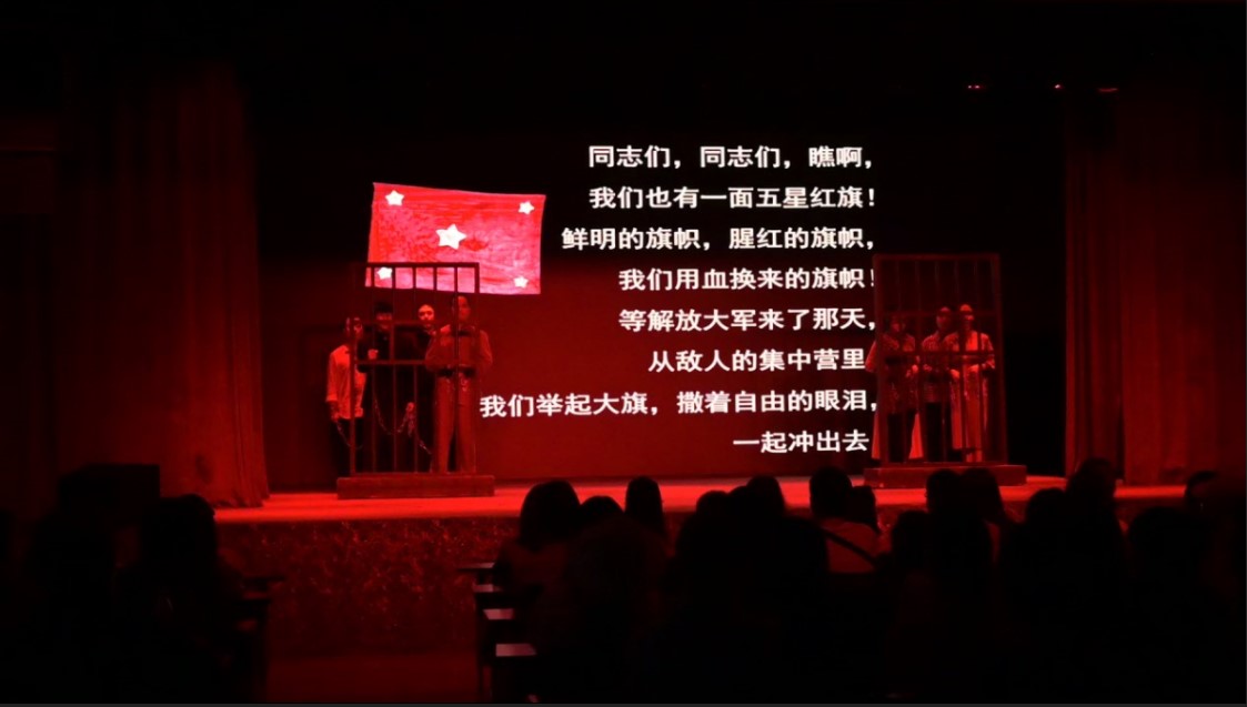 在歌乐剧场,同学们观看了《红岩革命故事展演》。整场展演依次讲述了五星红旗、11.27大屠杀、王朴、叶挺、江竹筠、狱中八条、蓝蒂裕的故事,通过情景短剧的形式,还原了烈士们在狱中顽强斗争的场景,充分展现了革命先烈为革命胜利甘愿奉献自己的决心和忠贞不渝的家国情怀。演艺工作者的倾情表演,赢得了同学们的阵阵掌声与喝彩。