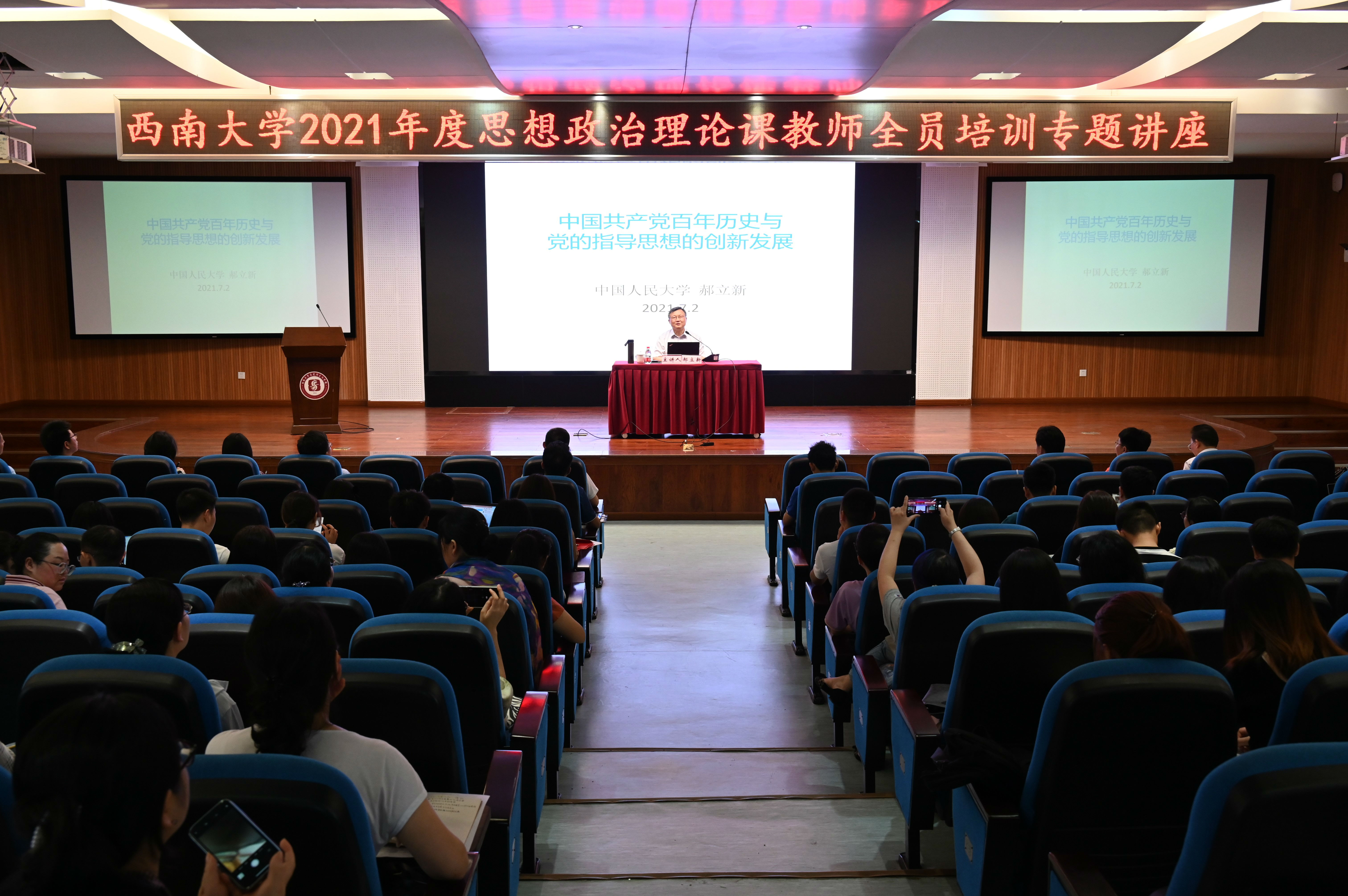为深入贯彻落实学习习近平总书记在庆祝中国共产党成立100周年大会上的重要讲话精神,同时切实加强学校思政课教师队伍建设,学校举办2021年度思想政治理论课专兼职教师全员培训专题讲座。2021年7月2日下午在bv伟德国际1946505学术报告厅邀请学校党委宣传部部长李荣华做“风雨兼程百年路,不忘初心再出发”主题导学,随后,中国人民大学郝立新教授以“中国共产党百年历史与党的指导思想的创新发展”为题进行了专题讲座。培训由bv伟德国际1946党委常务副书记廖晓衡主持,学校全体专兼职思想政治理论课教师参加。