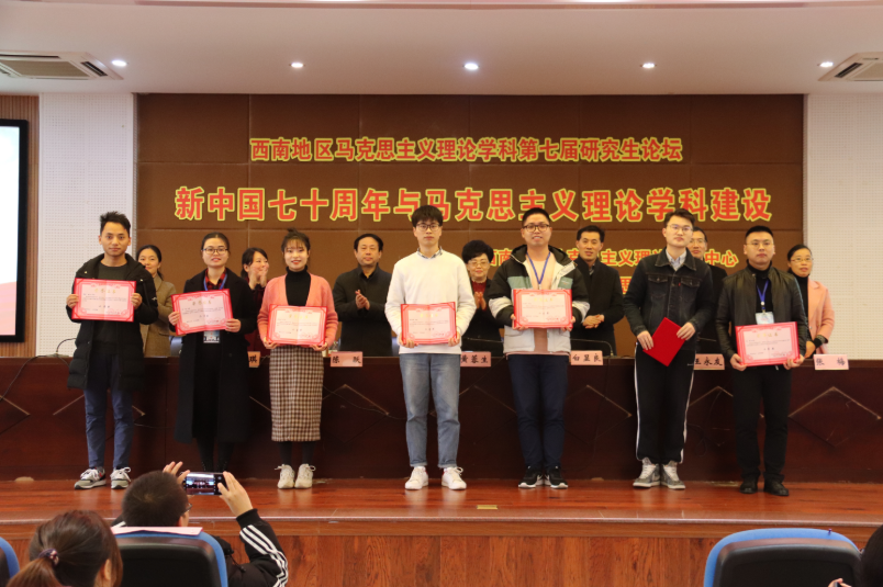 23日下午,论坛在bv伟德国际1946505报告厅圆满闭幕。bv伟德国际1946副院长何玲玲教授宣布表彰决定。本次论坛共评出获奖论文70篇,分设一等奖、二等奖、三等奖三个层次。获奖论文由西南师范大学出版社统一结集出版。与会的中心领导、学院领导为获奖作者进行了颁奖。中心副主任陈跃教授对本次论坛进行总结,他指出本次论坛呈现出议程紧凑、主题鲜明、参与面广、形式多样、研讨深入等特点,希望参会代表在后续的理论研究中,不忘初心、牢记使命,为奋力推进马克思主义理论学科发展作出应有贡献。