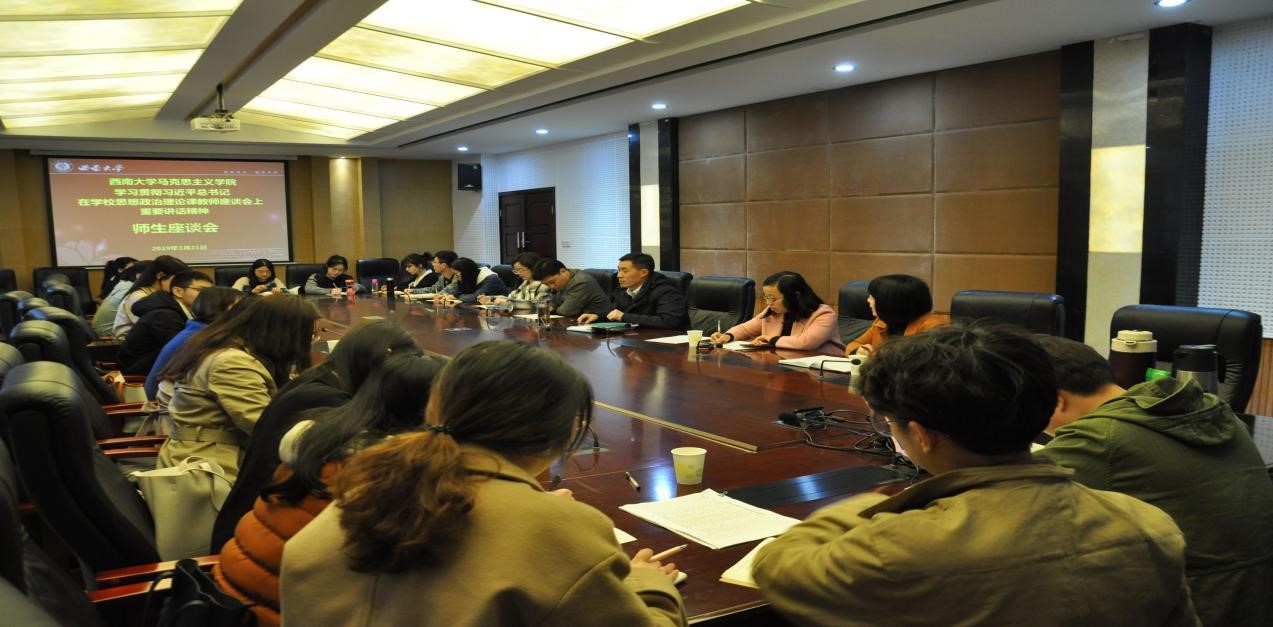 2019年3月21日下午,bv伟德国际1946在学院310会议室召开学习贯彻习近平总书记在学校思想政治理论课教师座谈会上重要讲话精神师生座谈会。参加本次座谈会的有bv伟德国际1946院长白显良、学院党委副书记张梅、学院党委副书记曾艳、学院博士生导师胡刘、学院团委书记李心悦,参加此次座谈会还有学院研究生、本科生代表。座谈会由学院党委副书记曾艳主持。