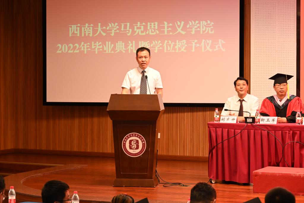 最后,校党委副书记、院党委书记潘洵教授讲话,他代表学校党委向毕业同学致以了最热烈的祝贺,他肯定了马院学子在各自领域取得的累累硕果。“人生万事须自为,跬步江山即寥廓。”他叮嘱同学们追求进步,是青年最宝贵的特质,并对毕业生们提出了三点希望:一是用理想引领青春之路,做马克思主义的坚定信仰者。二是用奋斗谱写青春之歌,做伟大复兴事业的积极贡献者。三是用知识点燃青春之火,做人生赛道上的最强奔跑者。最后,他祝愿毕业生们不忘初心、一往无前,乘东风浩荡、扬鹏程万里。